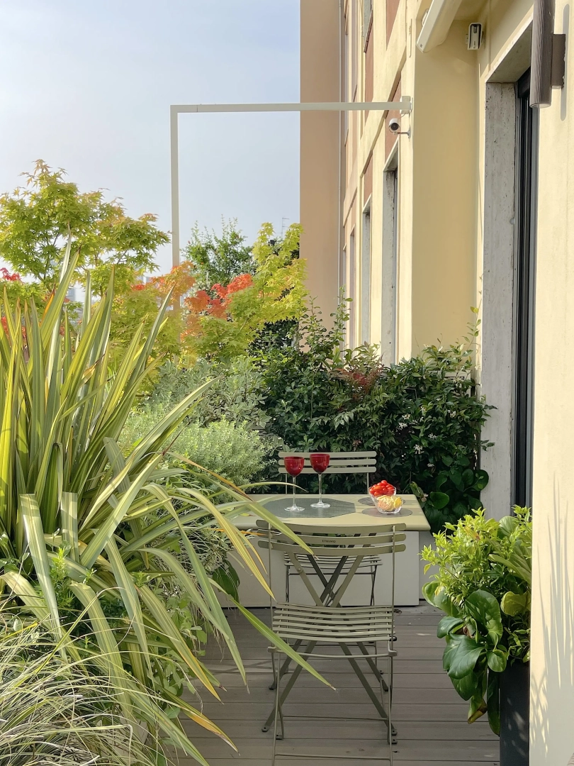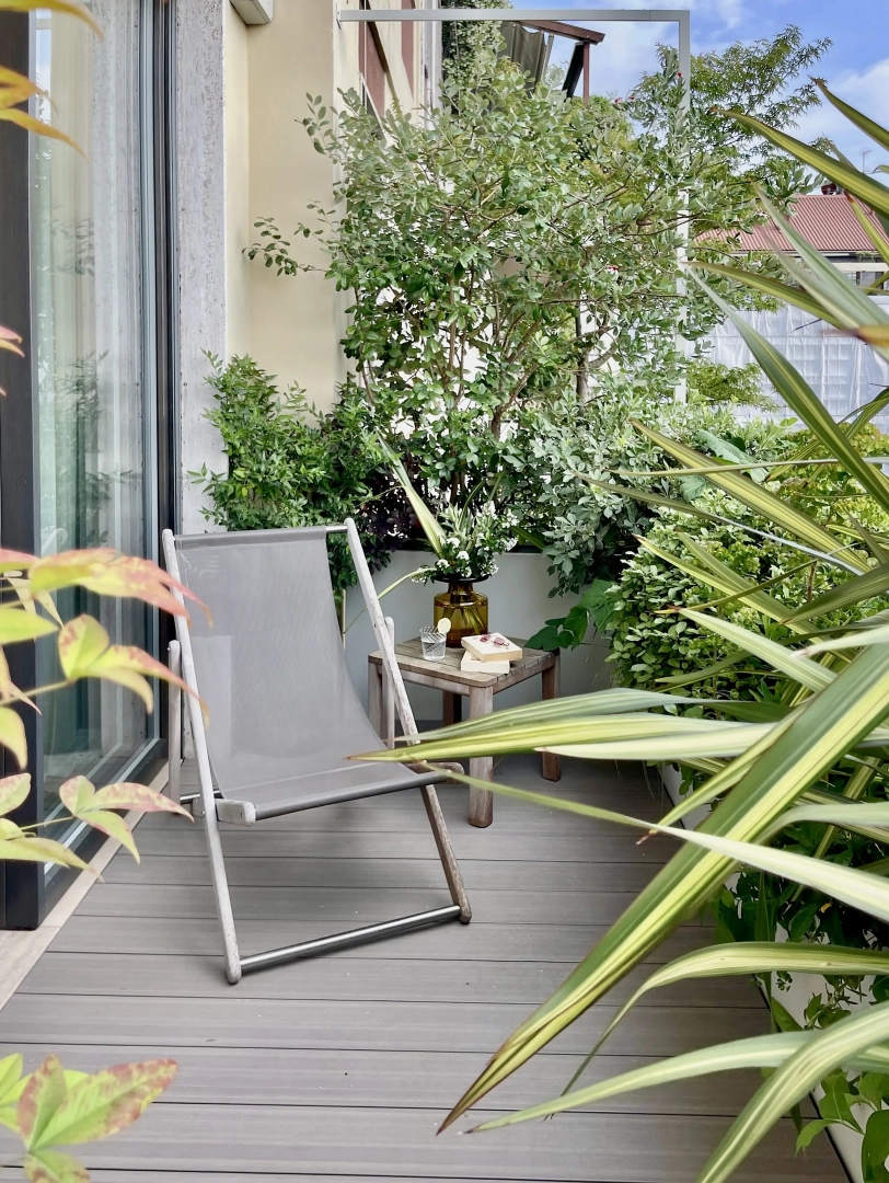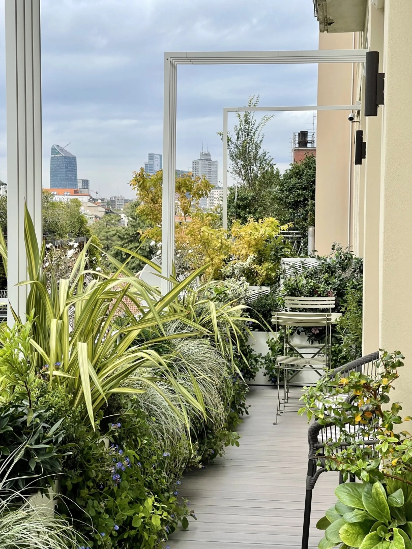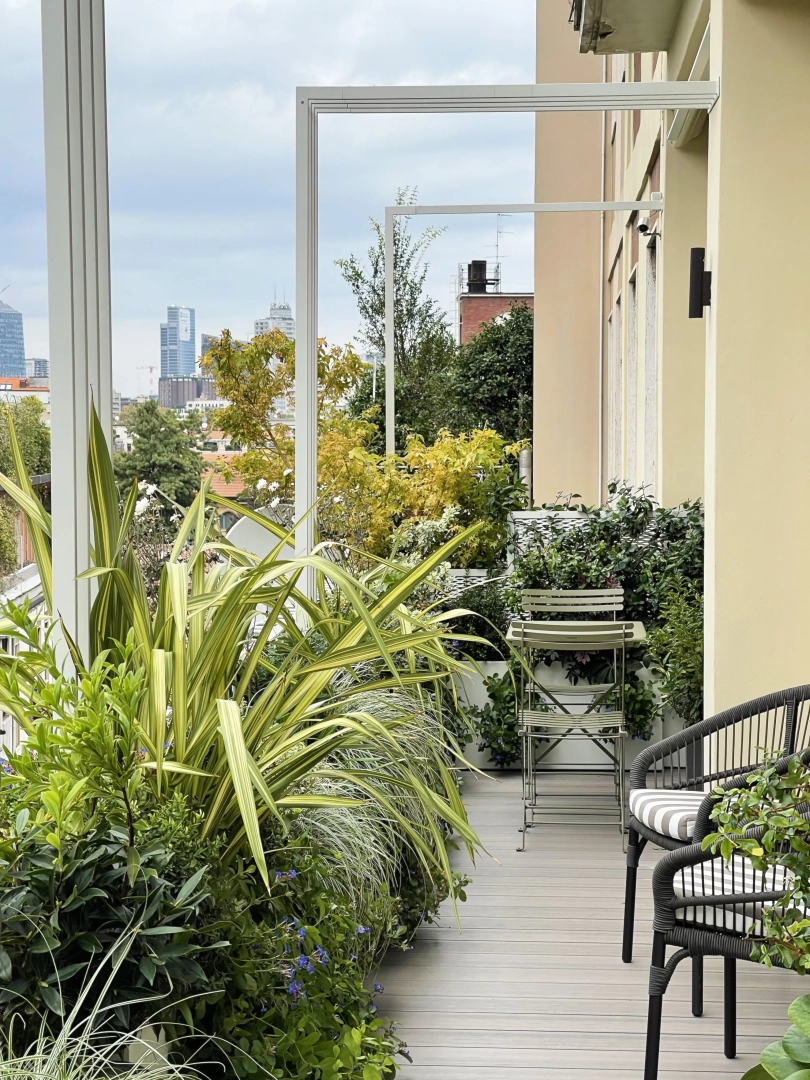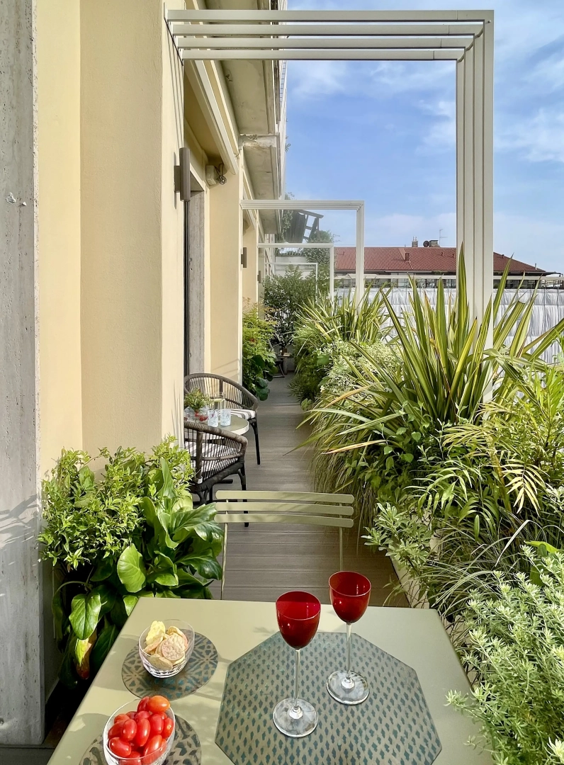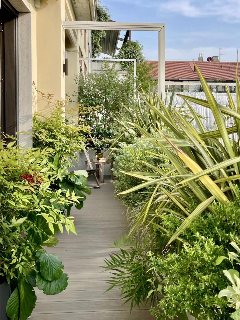 Archi metallici squadrati conferiscono ritmo e dinamicità, e definiscono una serie di ambienti simbolicamente distinti, connotati da arredi che ne definiscono la funzionalità: un piccolo tavolo da pranzo, due poltroncine per un drink, una sdraio per il relax. Nulla manca e, nonostante la larghezza limitata, resta spazio per le fioriere lunghe e strette, popolate da una moltitudine di piante, spumeggianti ma disciplinate.