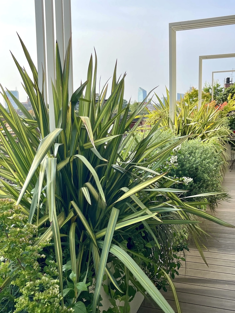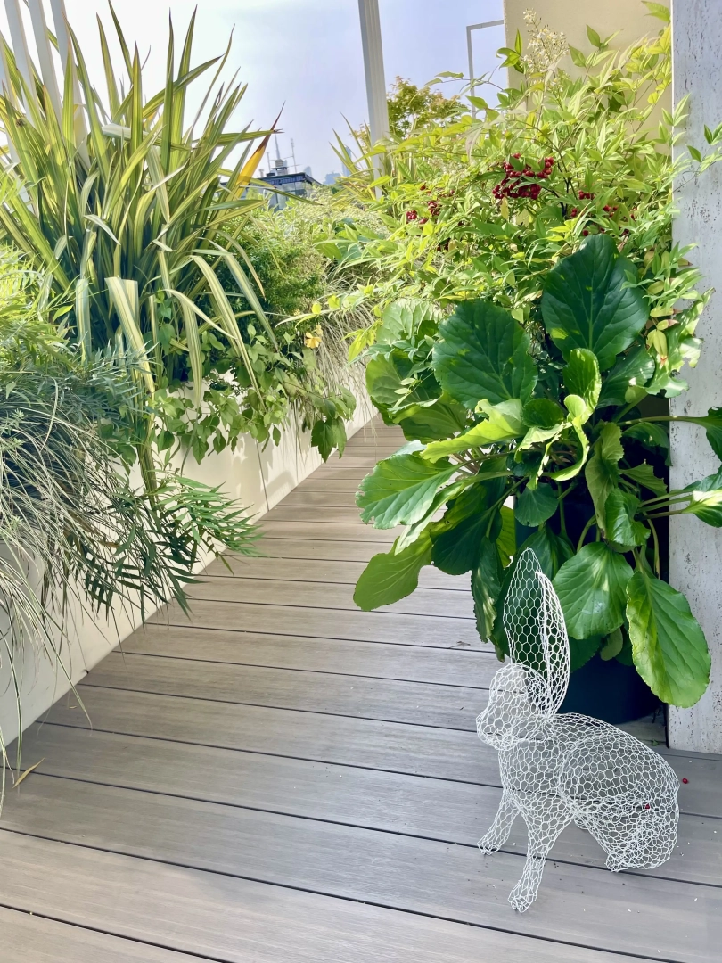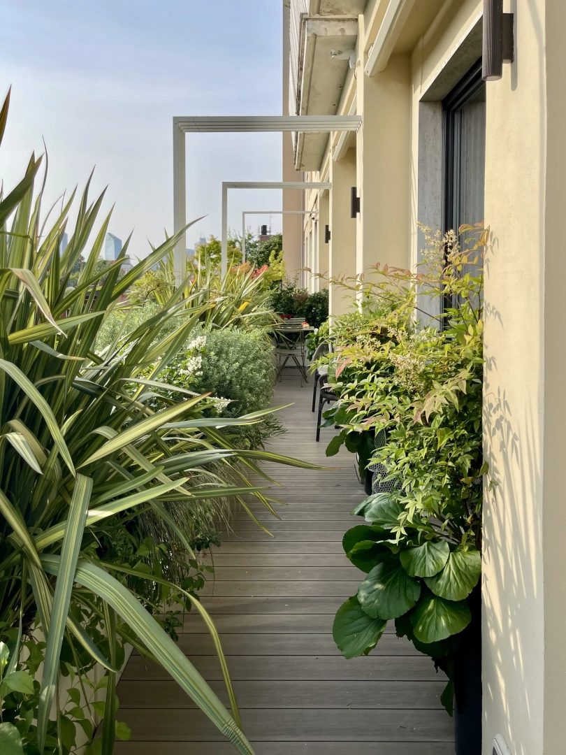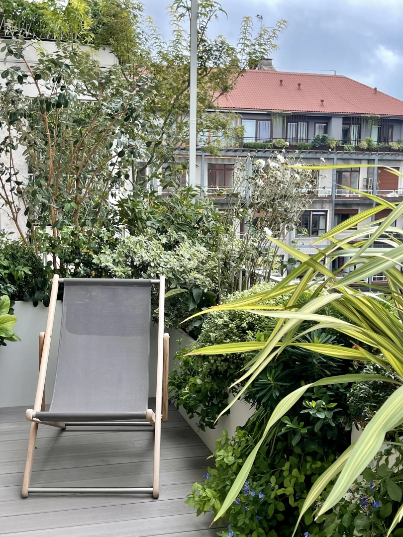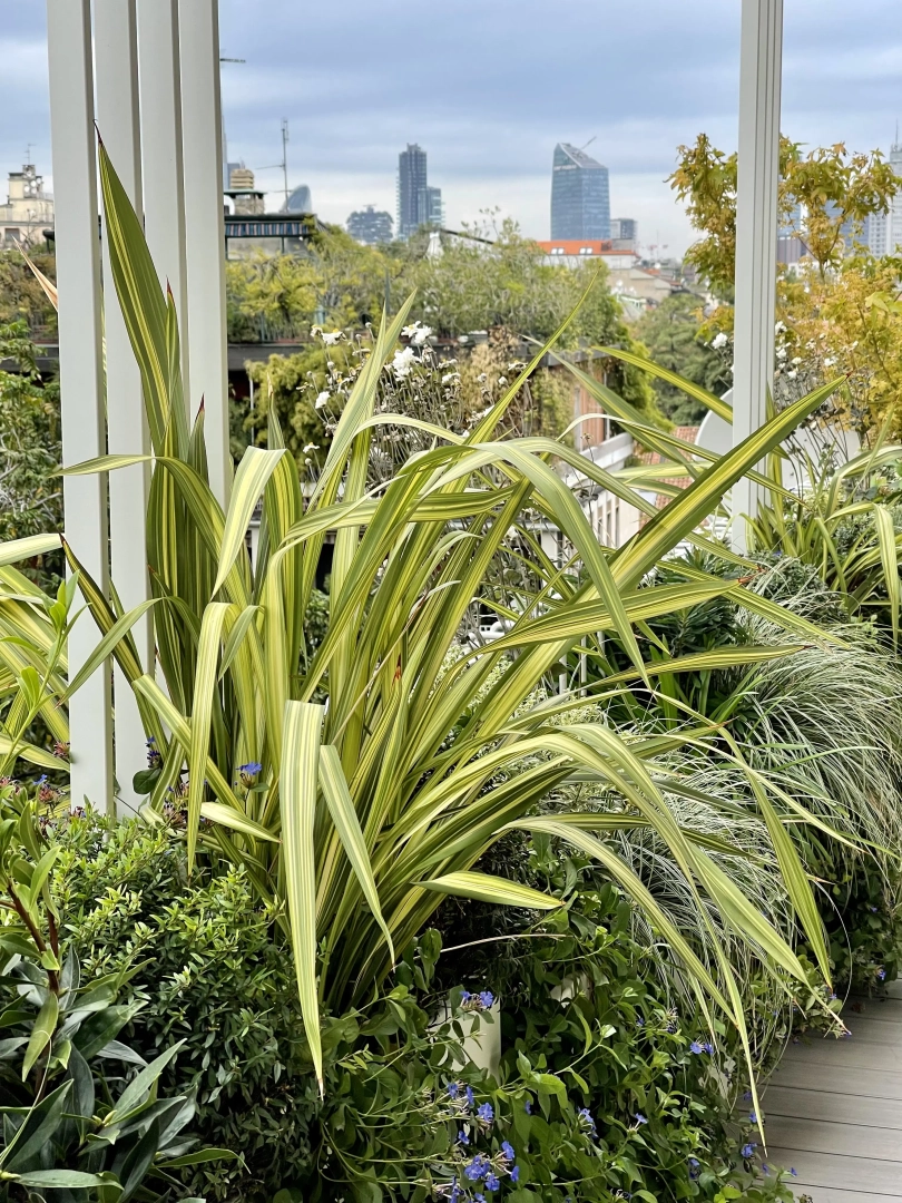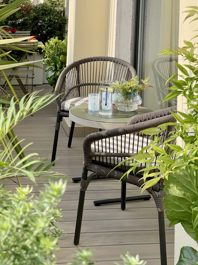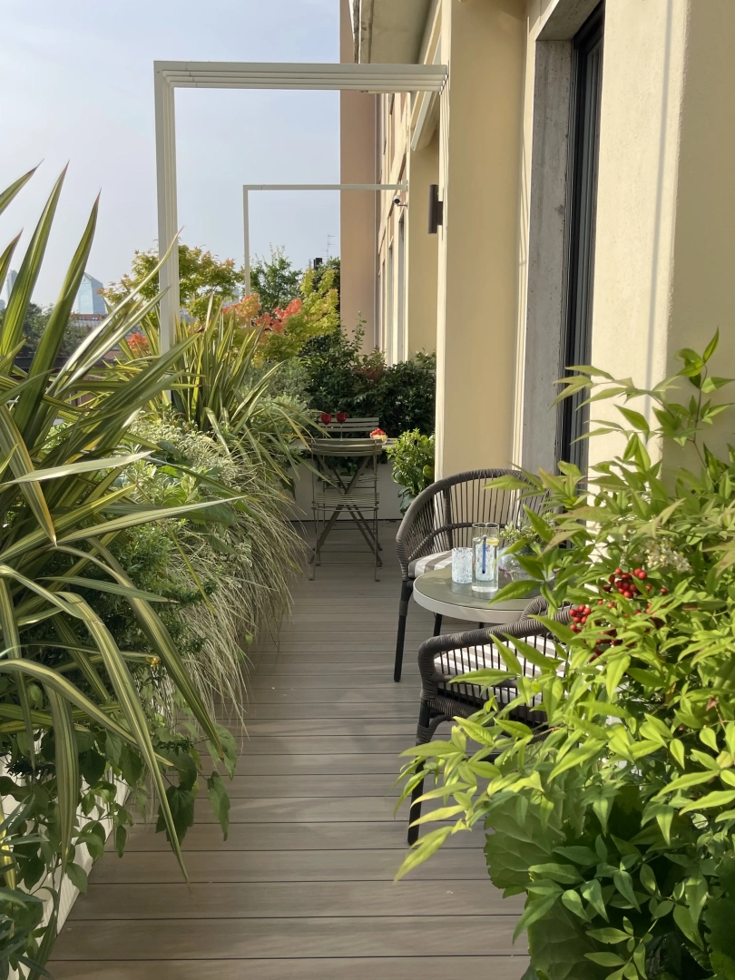 Archi metallici squadrati conferiscono ritmo e dinamicità, e definiscono una serie di ambienti simbolicamente distinti, connotati da arredi che ne definiscono la funzionalità: un piccolo tavolo da pranzo, due poltroncine per un drink, una sdraio per il relax. Nulla manca e, nonostante la larghezza limitata, resta spazio per le fioriere lunghe e strette, popolate da una moltitudine di piante, spumeggianti ma disciplinate.