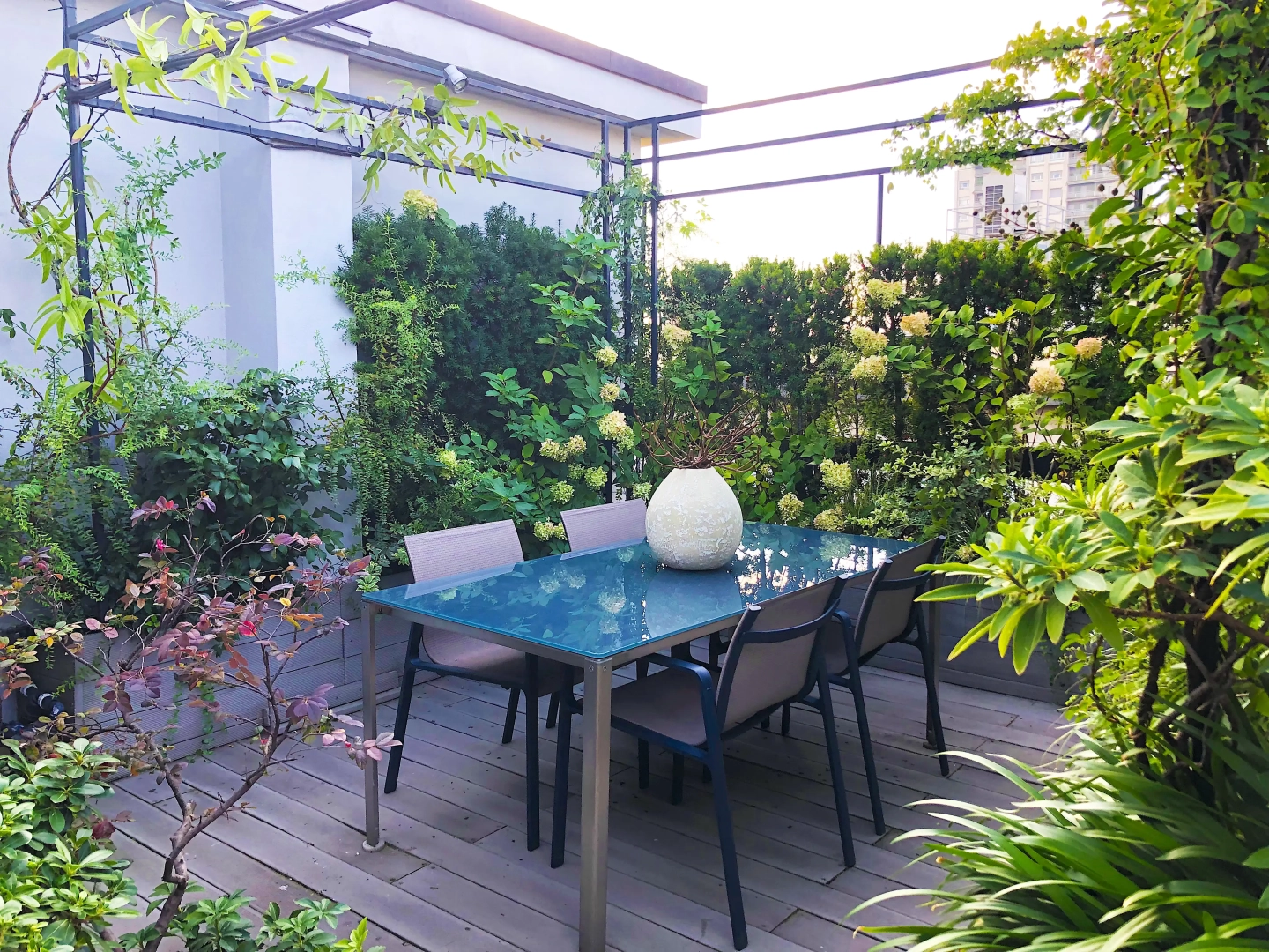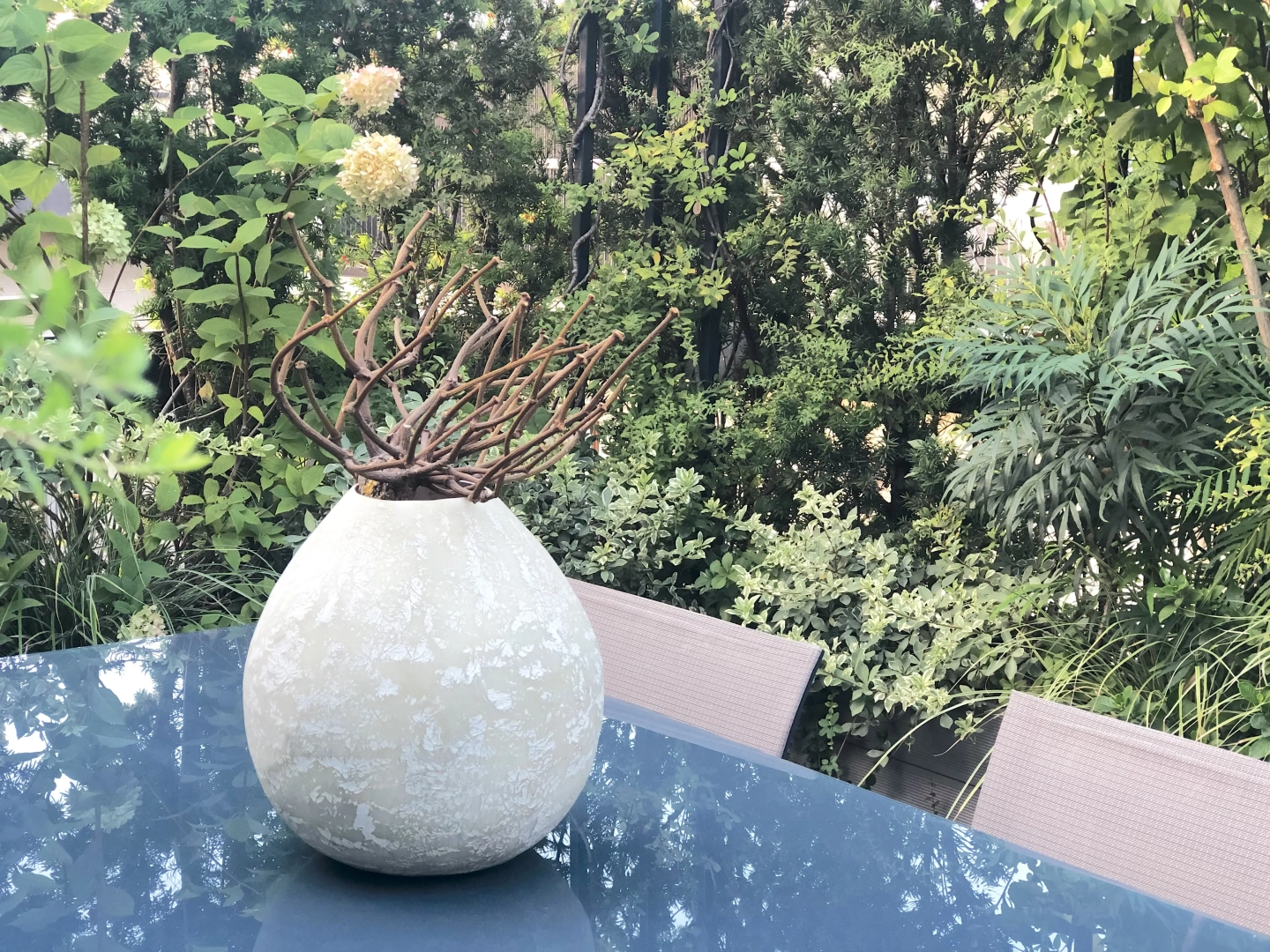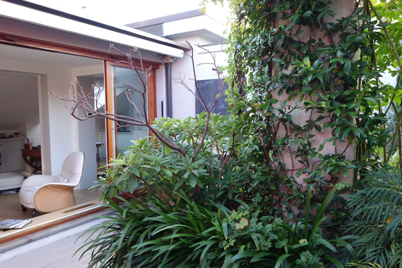 Un terrazzo rivisitato nell’impianto vegetale, come conseguenza della necessità di rinnovare l’impermeabilizzazione, di cui si è mantenuta la struttura preesistente, precedentemente progettata. Lo stile è stato reinterpretato dando accento alle geometrie: i tratti squadrati del pergolato sono riproposti nelle siepi di carpino e tasso, potate a parallelepipedo, ammorbidite dalle linee libere di ortensie dai bianchi e luminosi panicoli, e di spireee dalle foglie minute e leggere.