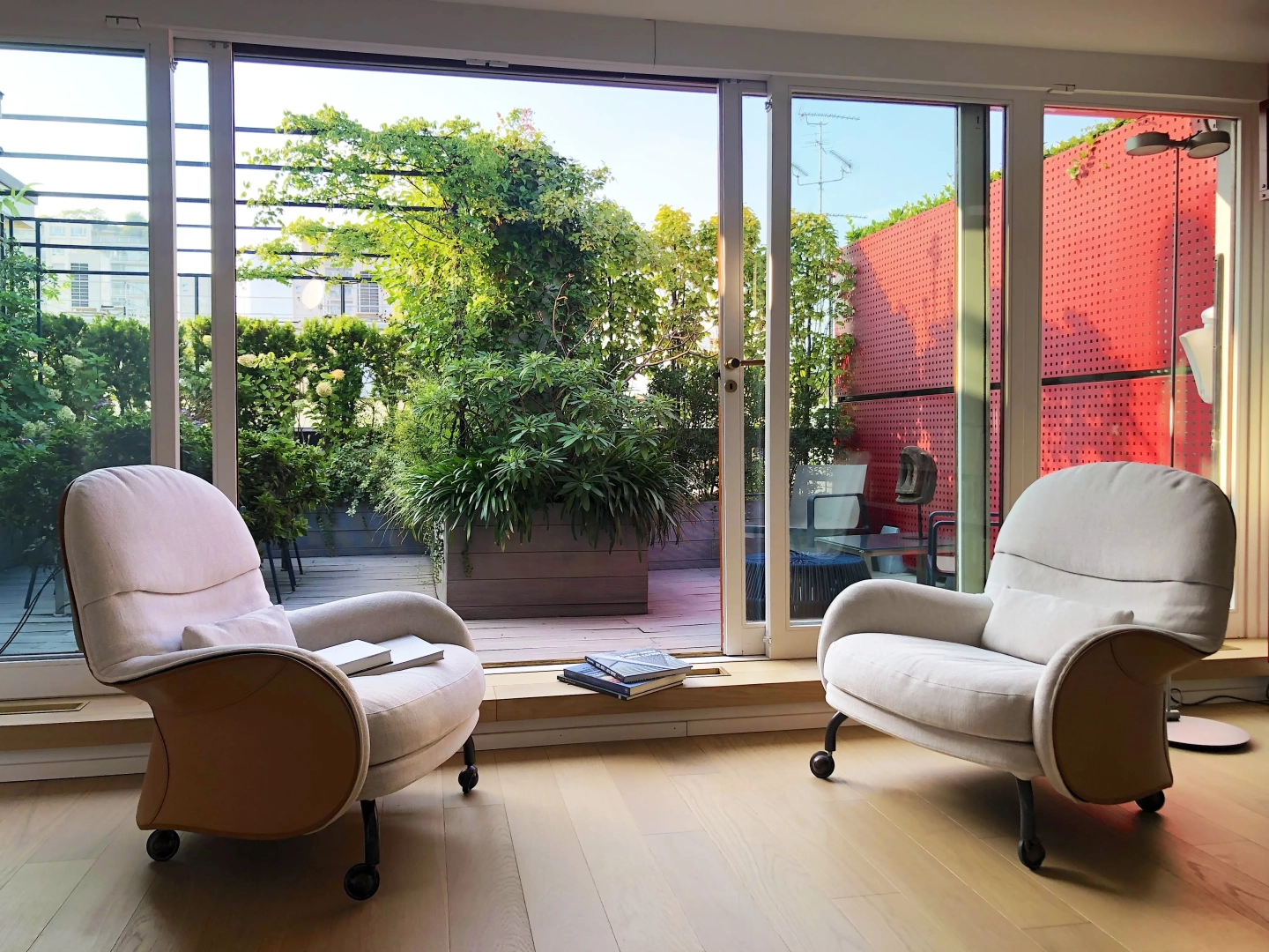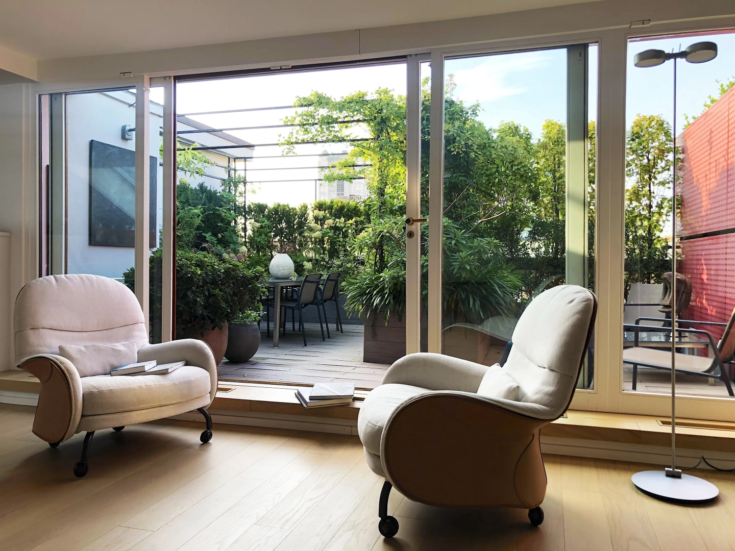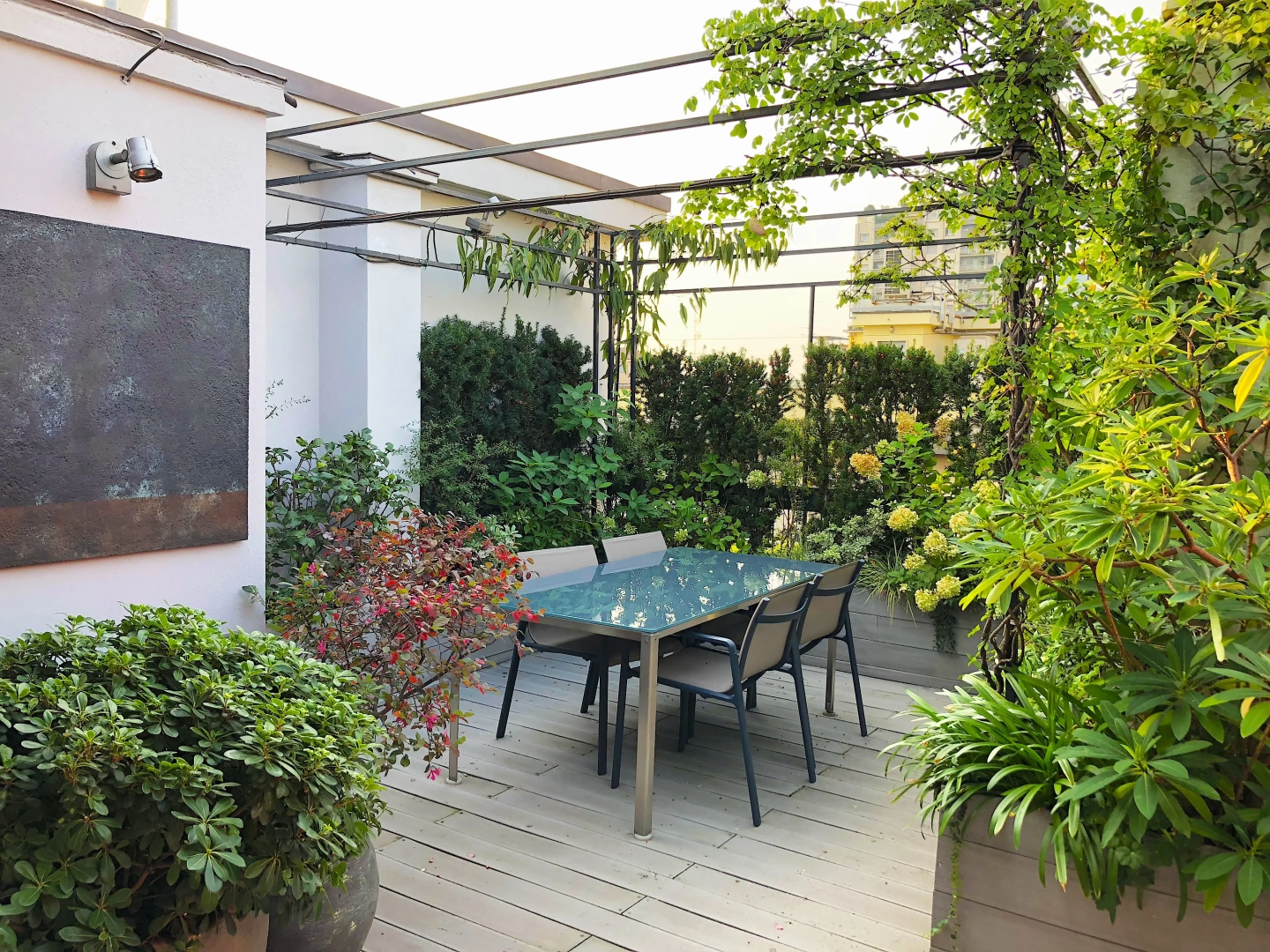 Un terrazzo rivisitato nell’impianto vegetale, come conseguenza della necessità di rinnovare l’impermeabilizzazione, di cui si è mantenuta la struttura preesistente, precedentemente progettata. Lo stile è stato reinterpretato dando accento alle geometrie: i tratti squadrati del pergolato sono riproposti nelle siepi di carpino e tasso, potate a parallelepipedo, ammorbidite dalle linee libere di ortensie dai bianchi e luminosi panicoli, e di spireee dalle foglie minute e leggere.