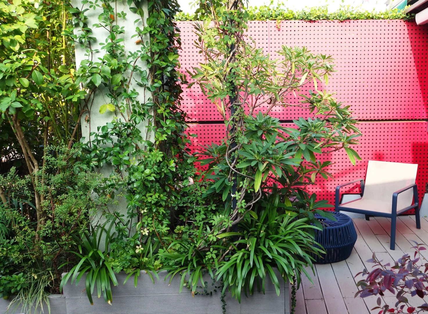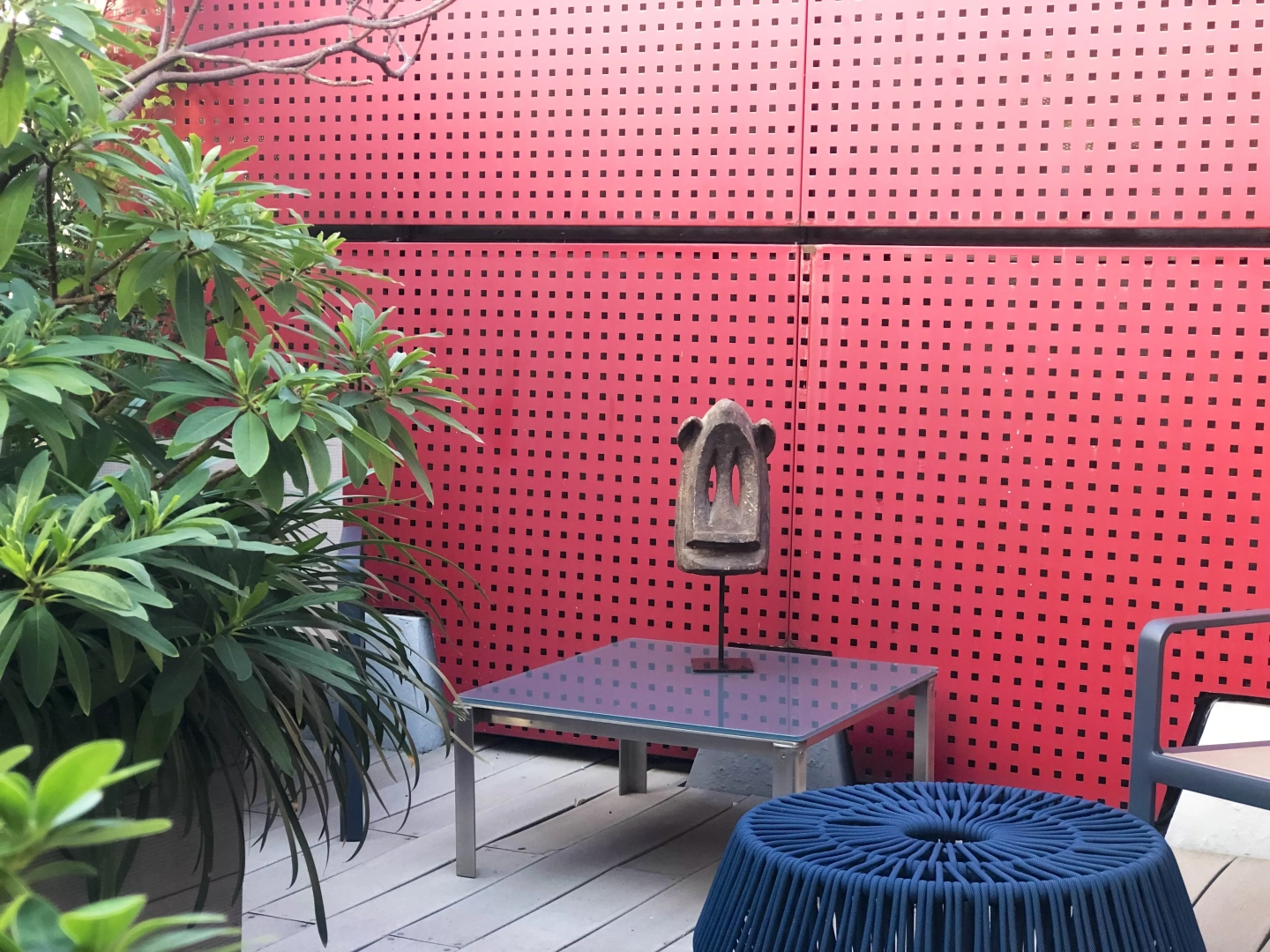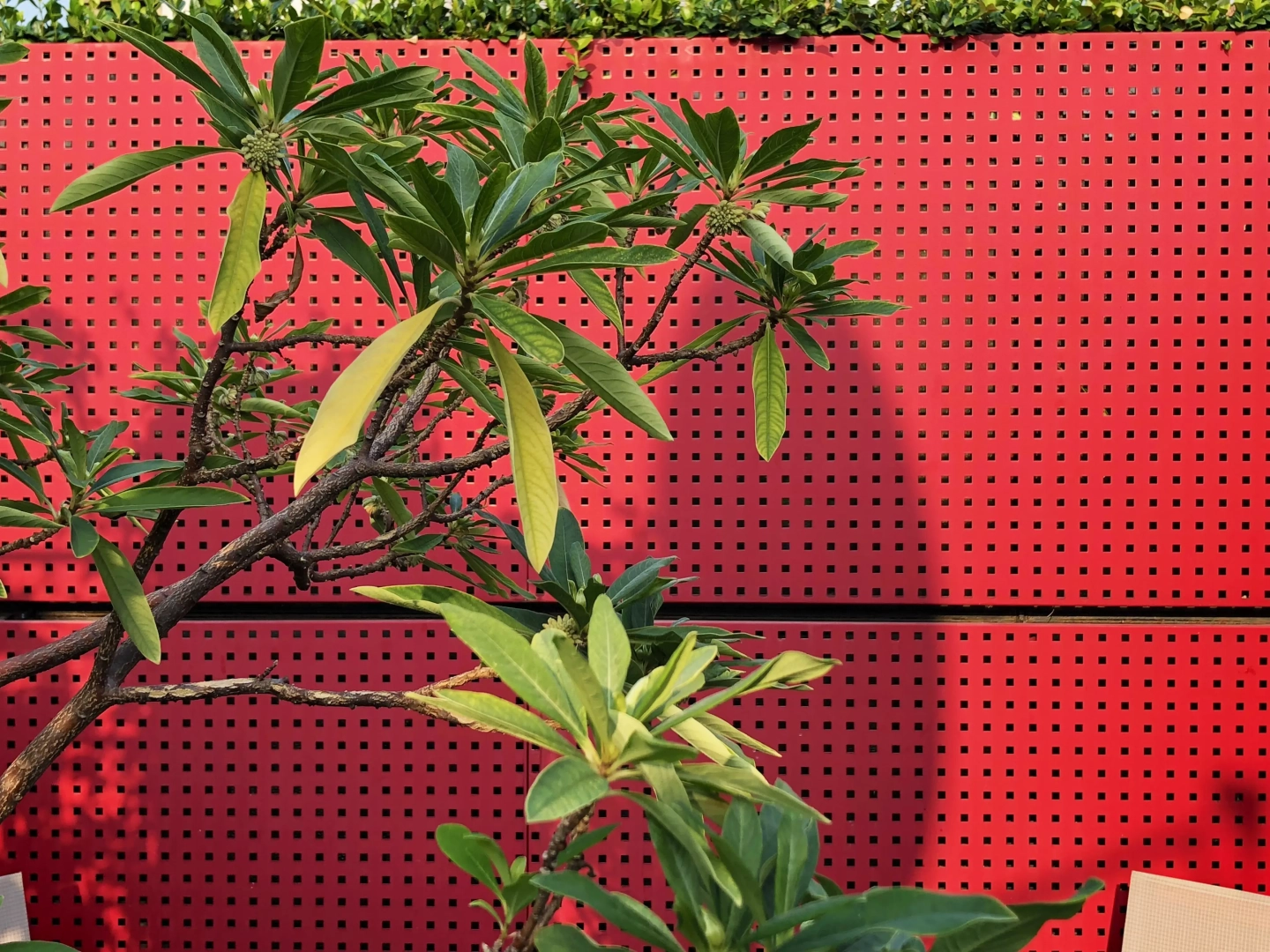 La sinuosità architettonica di una Edgeworthia crysantha è esaltata dallo sfondo: un pannello metallico traforato, rosso lacca, che delimita la proprietà.