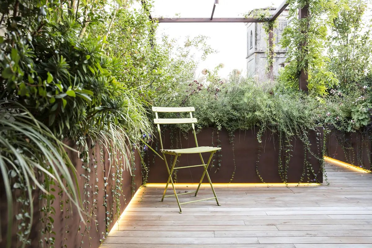 Una piccola stanza traboccante di fronde e di fiori incornicia e cattura il paesaggio circostante, annullando i confini. Una capsula di salvataggio, un microspazio segreto, dedicato alla convivialità ed al relax e curato nei minimi dettagli.