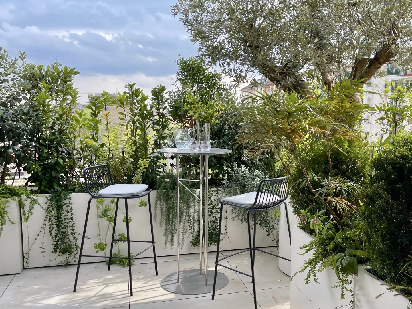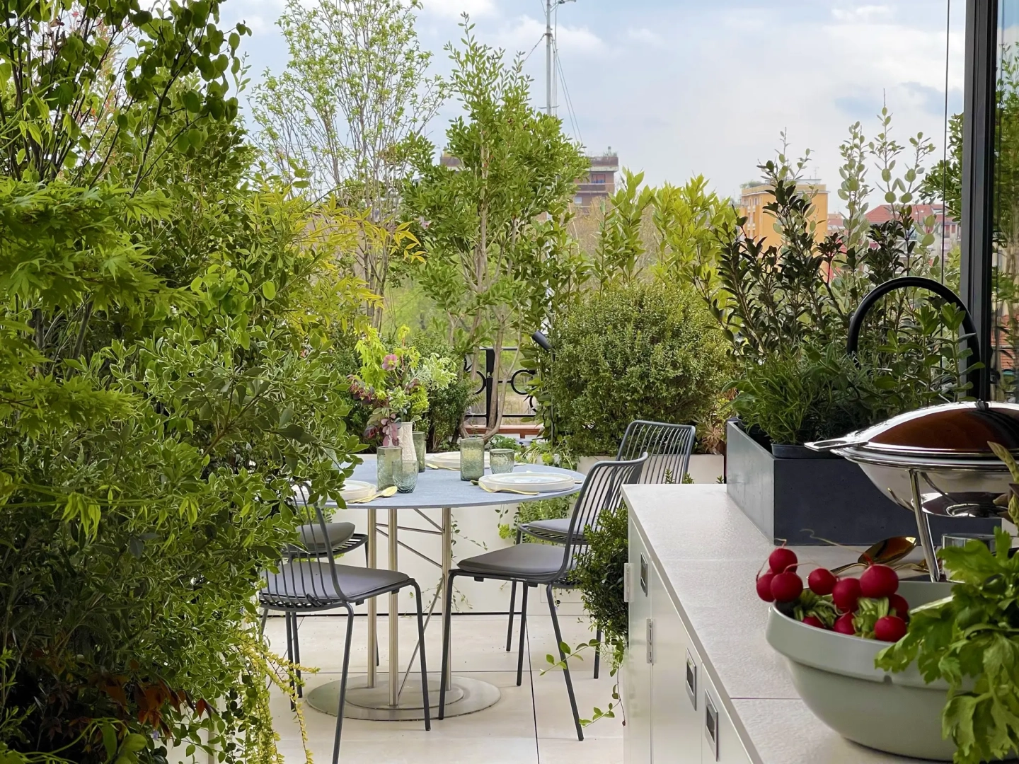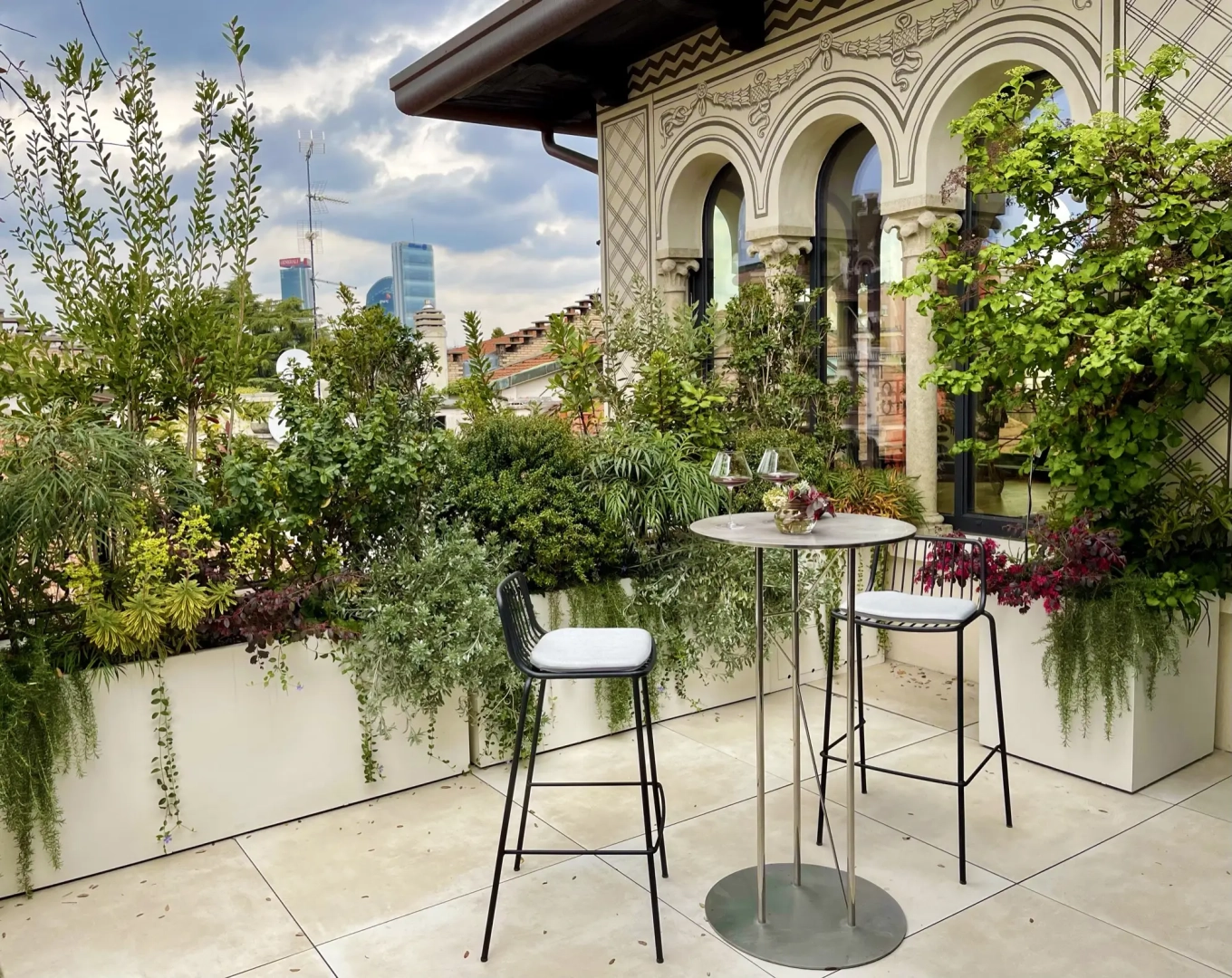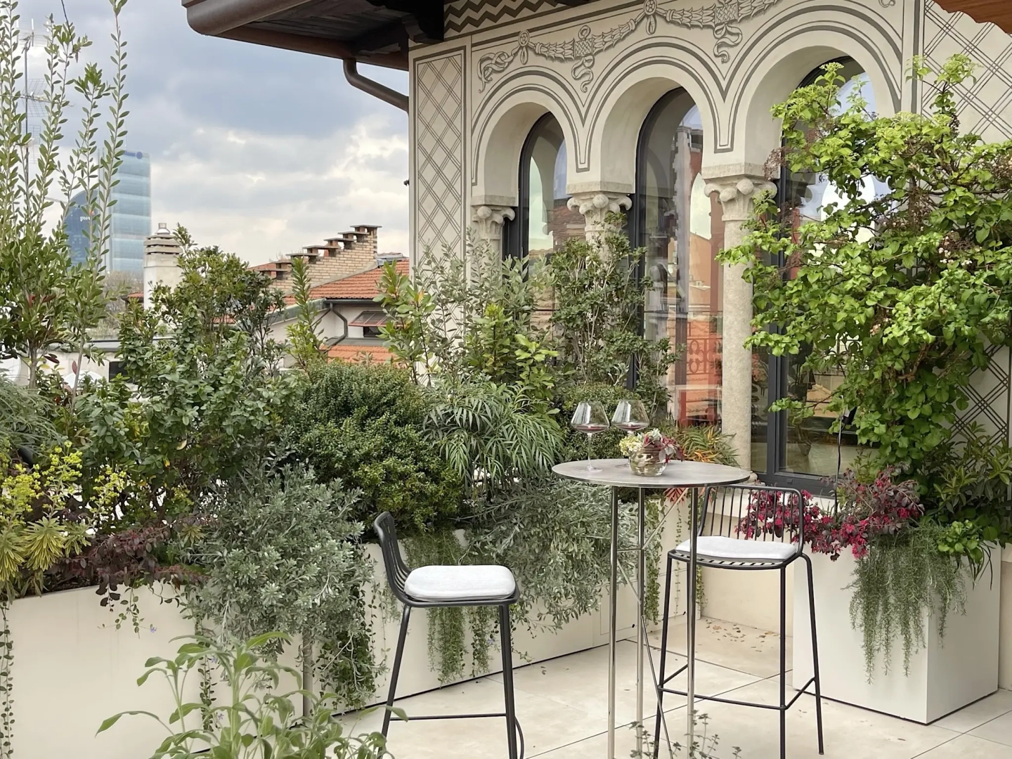 Agli angoli del quadrilatero ampie vasche cilindriche accolgono esemplari di piante mediterranee, passione del proprietario di casa; accanto ad ognuna di esse, piccoli tavoli e sedie svettanti, eleganti e con ridotto ingombro, invitano ad una piacevole sosta, tra il verde esuberante e movimentato. Lo skyline milanese emerge protagonista in vari punti del terrazzo, catturando lo sguardo e regalando una sensazione di spazialità.