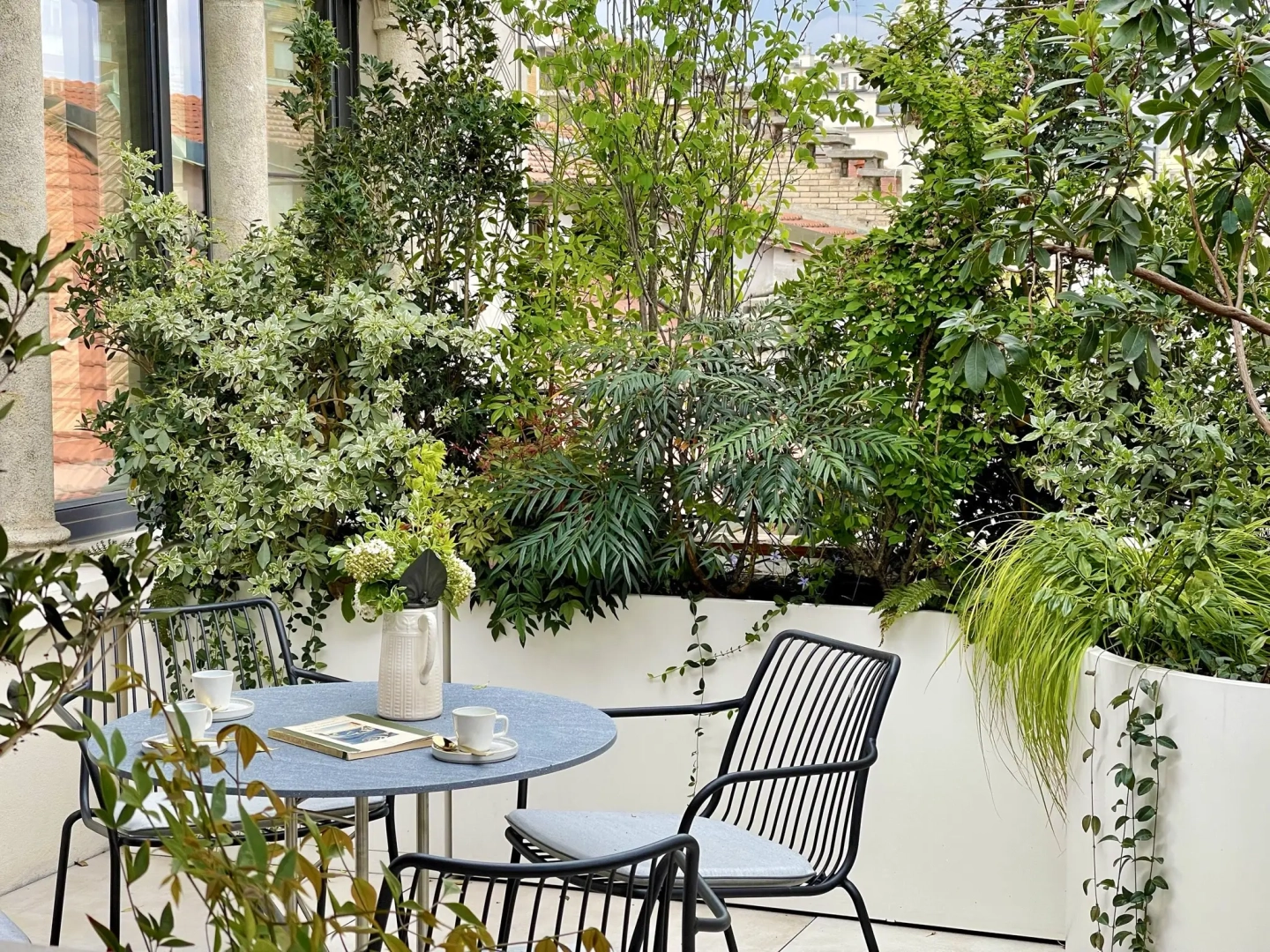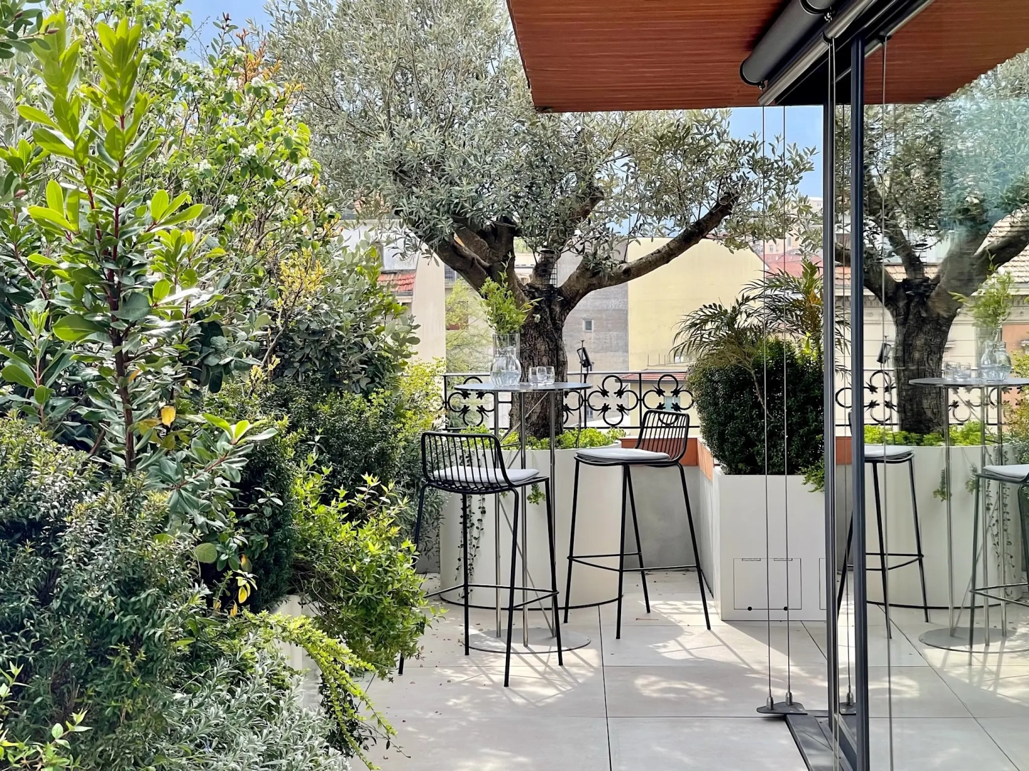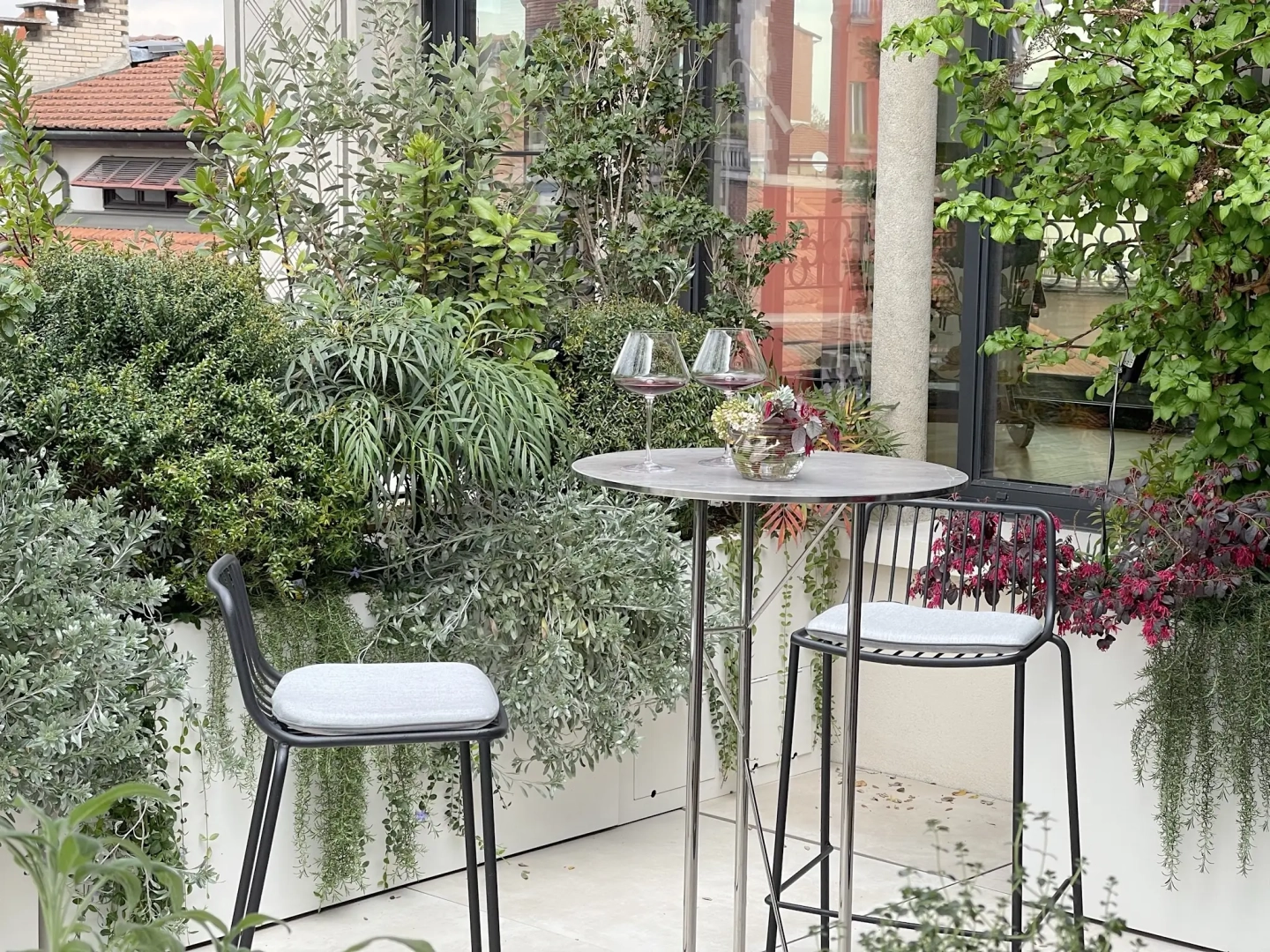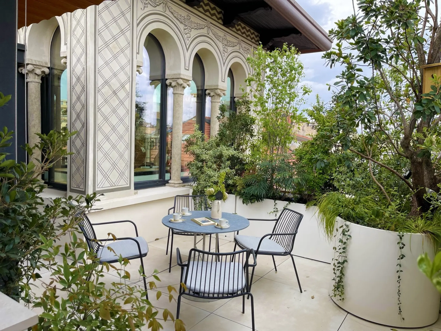 Agli angoli del quadrilatero ampie vasche cilindriche accolgono esemplari di piante mediterranee, passione del proprietario di casa; accanto ad ognuna di esse, piccoli tavoli e sedie svettanti, eleganti e con ridotto ingombro, invitano ad una piacevole sosta, tra il verde esuberante e movimentato. Lo skyline milanese emerge protagonista in vari punti del terrazzo, catturando lo sguardo e regalando una sensazione di spazialità.