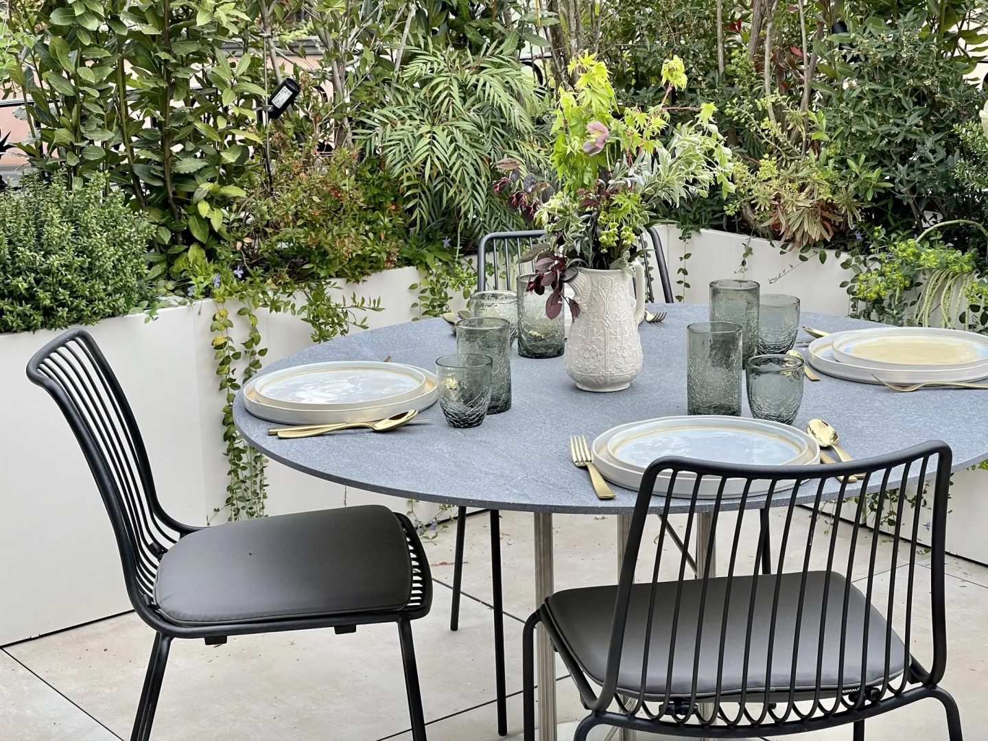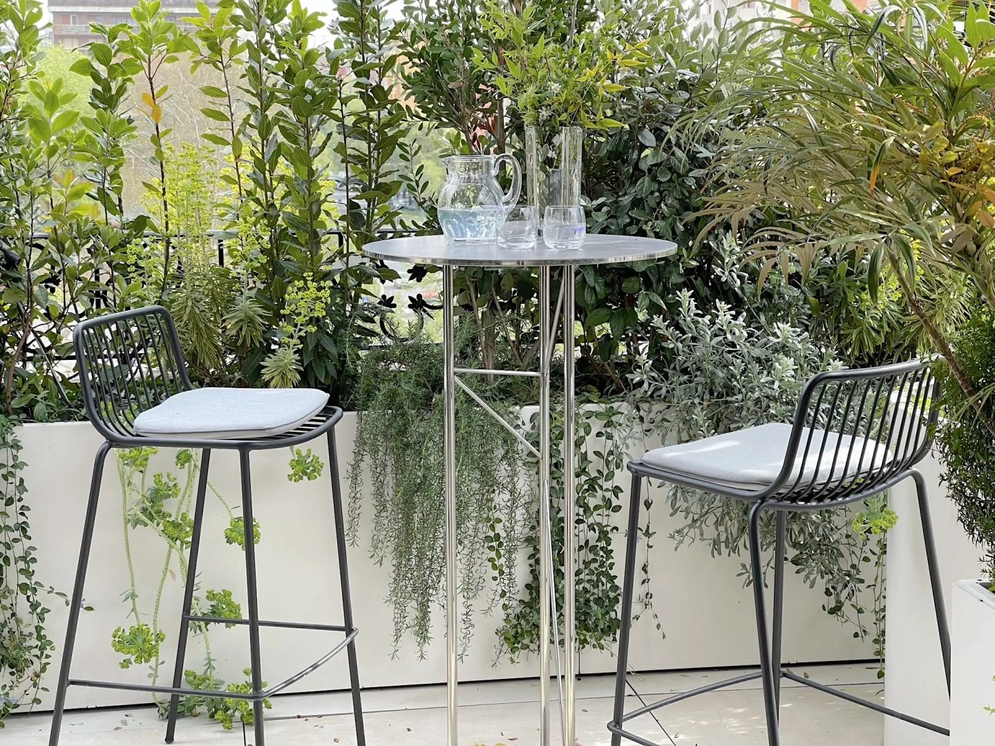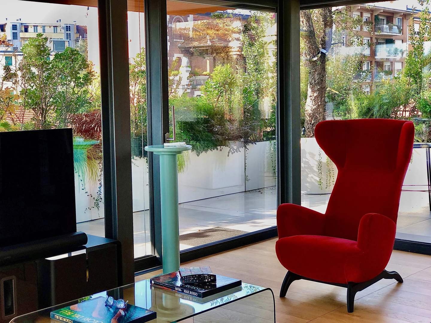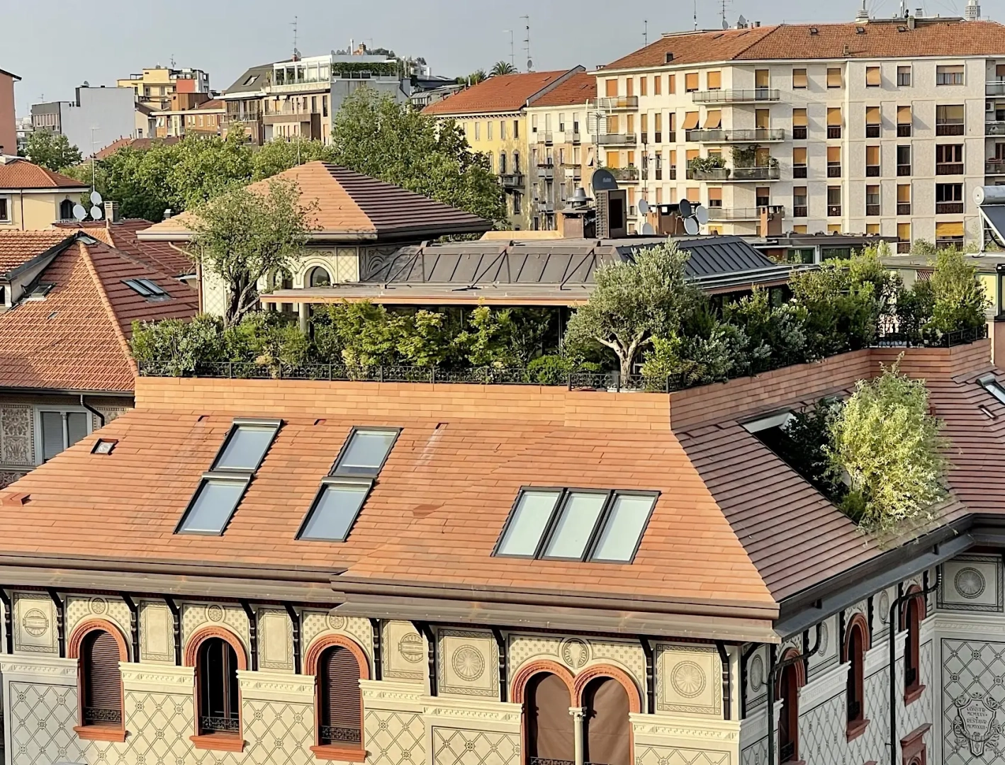Agli angoli del quadrilatero ampie vasche cilindriche accolgono esemplari di piante mediterranee, passione del proprietario di casa; accanto ad ognuna di esse, piccoli tavoli e sedie svettanti, eleganti e con ridotto ingombro, invitano ad una piacevole sosta, tra il verde esuberante e movimentato. Lo skyline milanese emerge protagonista in vari punti del terrazzo, catturando lo sguardo e regalando una sensazione di spazialità.