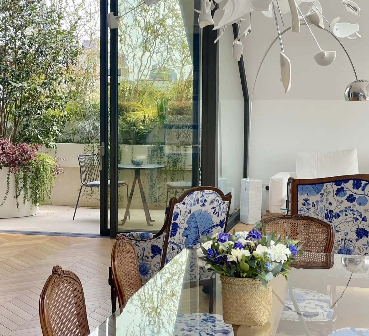 Al piano inferiore, una tasca verde rappresenta il fulcro intorno a cui si sviluppano varie stanze, e costituisce un irresistibile punto focale. Nonostante le ridotte dimensioni, la giustapposizione di contenitori di altezze diverse popolati di piante dilata lo spazio. L’accurata selezione botanica ha dato vita ad un mini boschetto casalingo, grazie ad alcuni salici contorti affiancati: la ricca trama di rami flessibili accoglie numerosi piccoli uccelli di passaggio, che allietano con la loro presenza, mentre il vento attraversando le chiome sottili accende un movimento lieve capace di rapire ed incantare gli occhi.