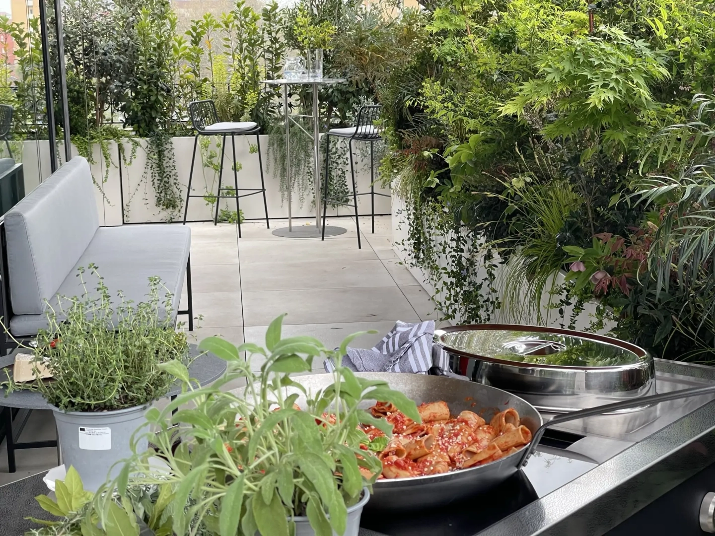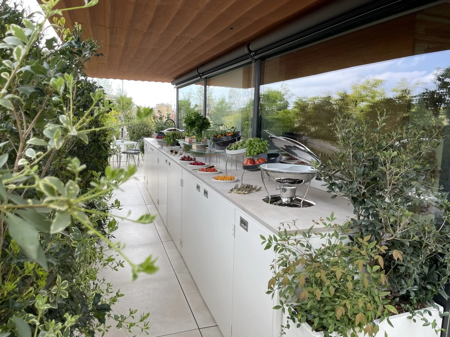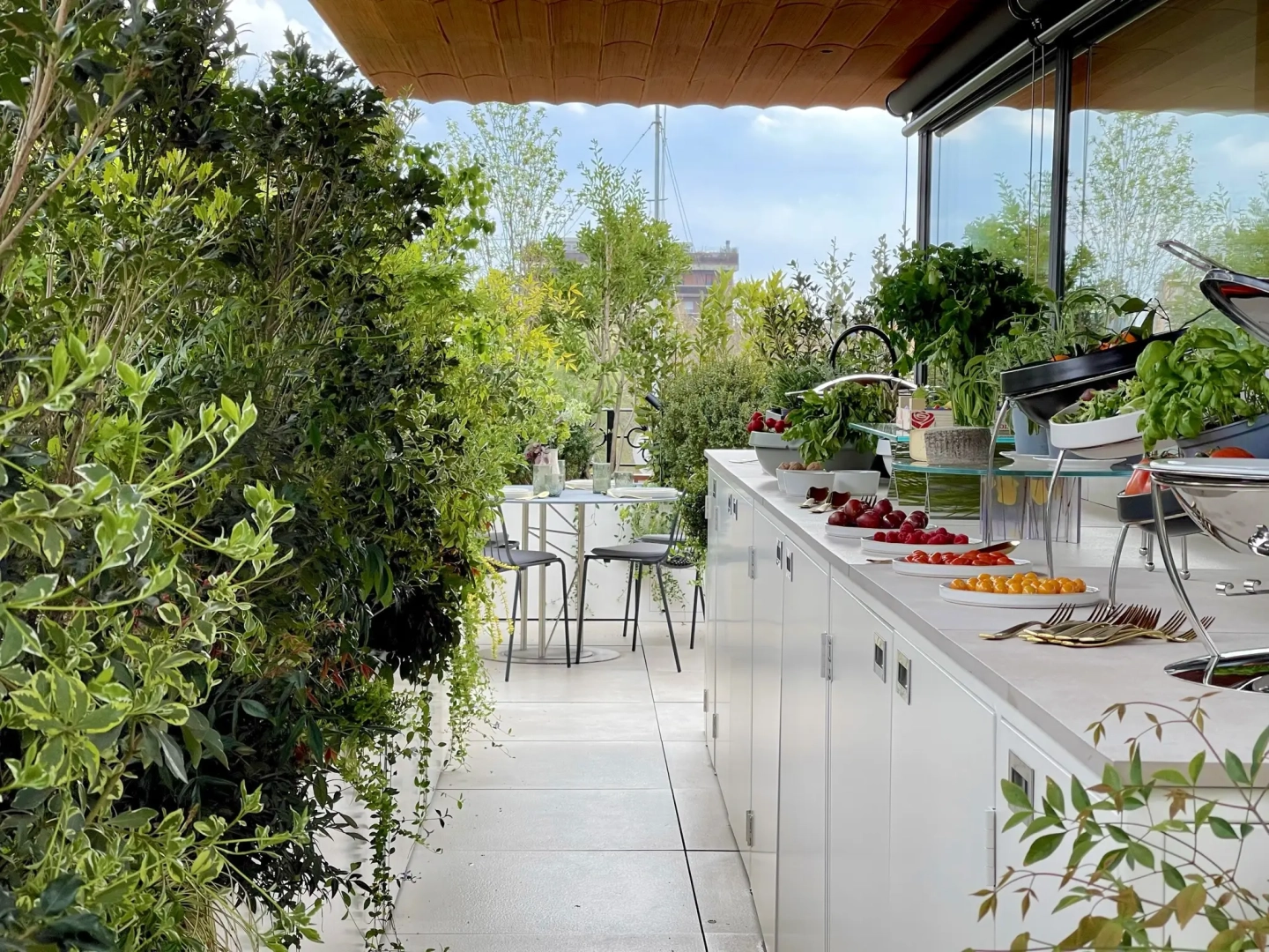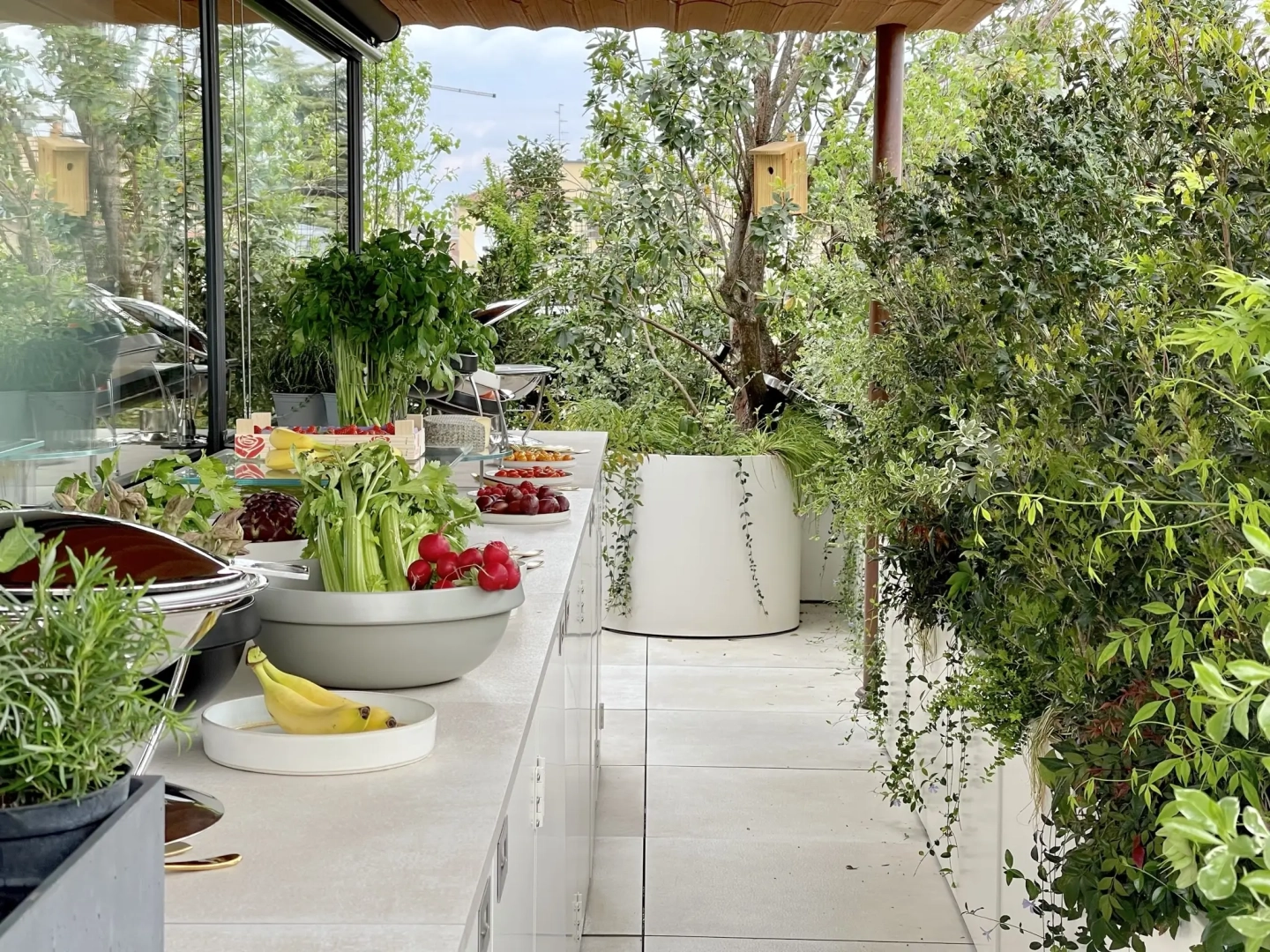 Le fioriere e gli arredi sono stati creati appositamente su disegno dall’azienda La Tavola, all’avanguardia nella realizzazione di prodotti ad alto grado di sofisticatezza nell’universo dei buffet.