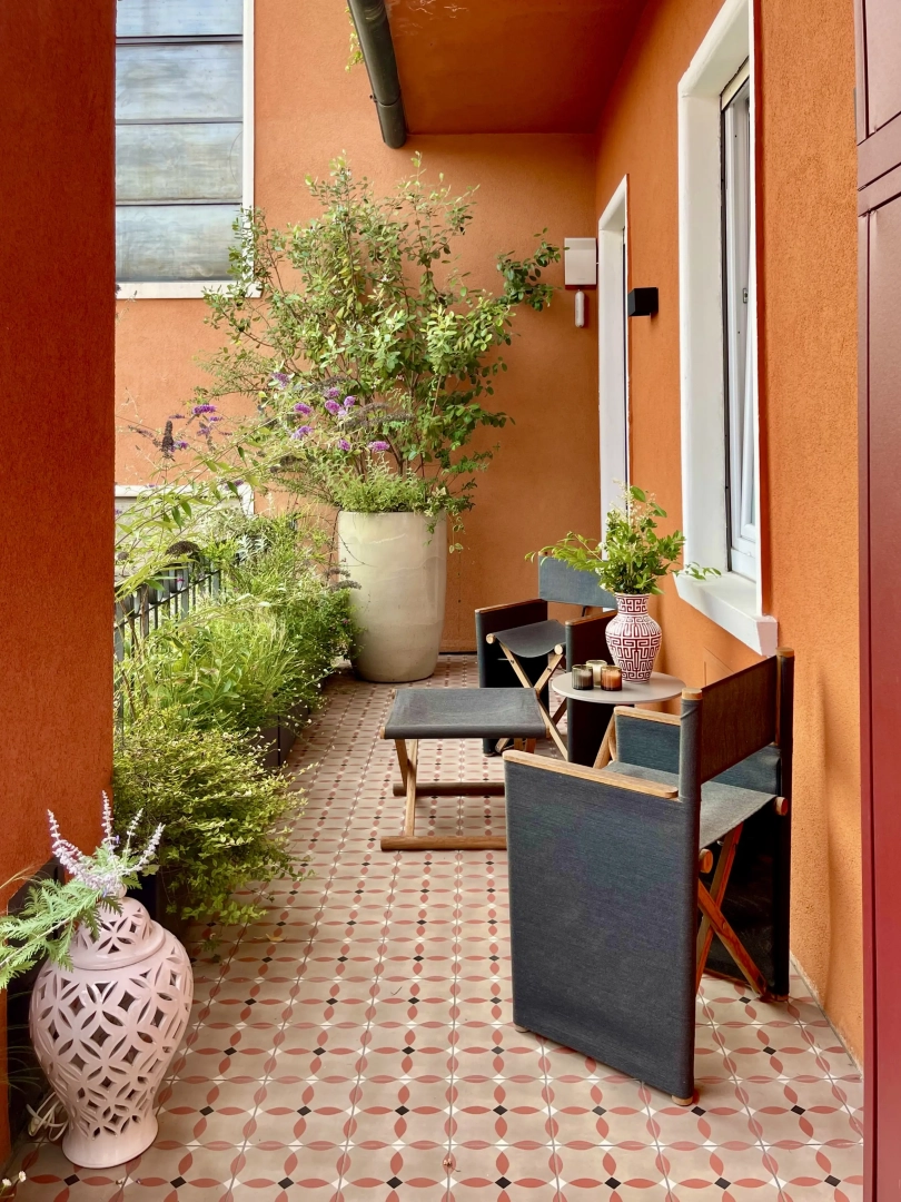 Due terrazzi per una casa, diversamente esposti, ma entrambi votati all’accoglienza e alla convivialità. Quello più ampio accoglie, oltre al tavolo da pranzo ed alla zona salotto, una zona cucina dove preparare succulenti BBQ: pur essendo immersi nel verde, ovunque le piante convivono armoniosamente con gli spazi funzionali, vivacizzandoli senza interferenze. Il terrazzo più piccolo, lungo e stretto, crea un’ambiente informale ma sofisticato per un pranzo romantico o uno spuntino veloce, per leggere il giornale godendo della vista del panorama circostante o per una chiacchierata rilassata sorseggiando un drink. Con la calda complicità del color arancio.