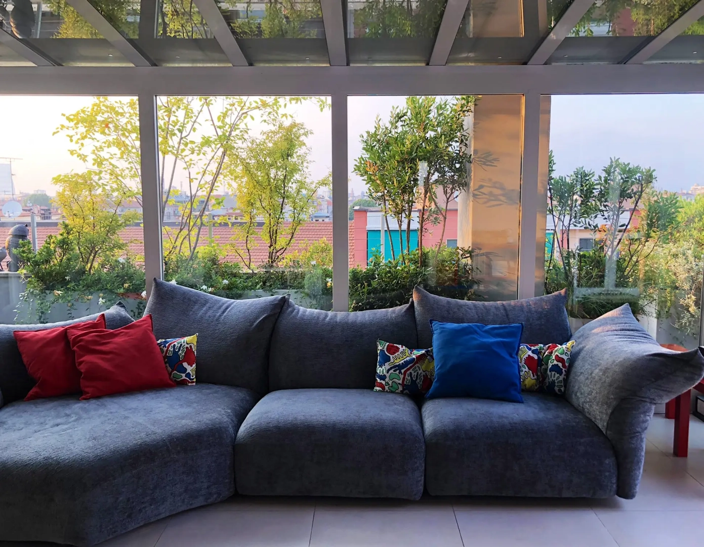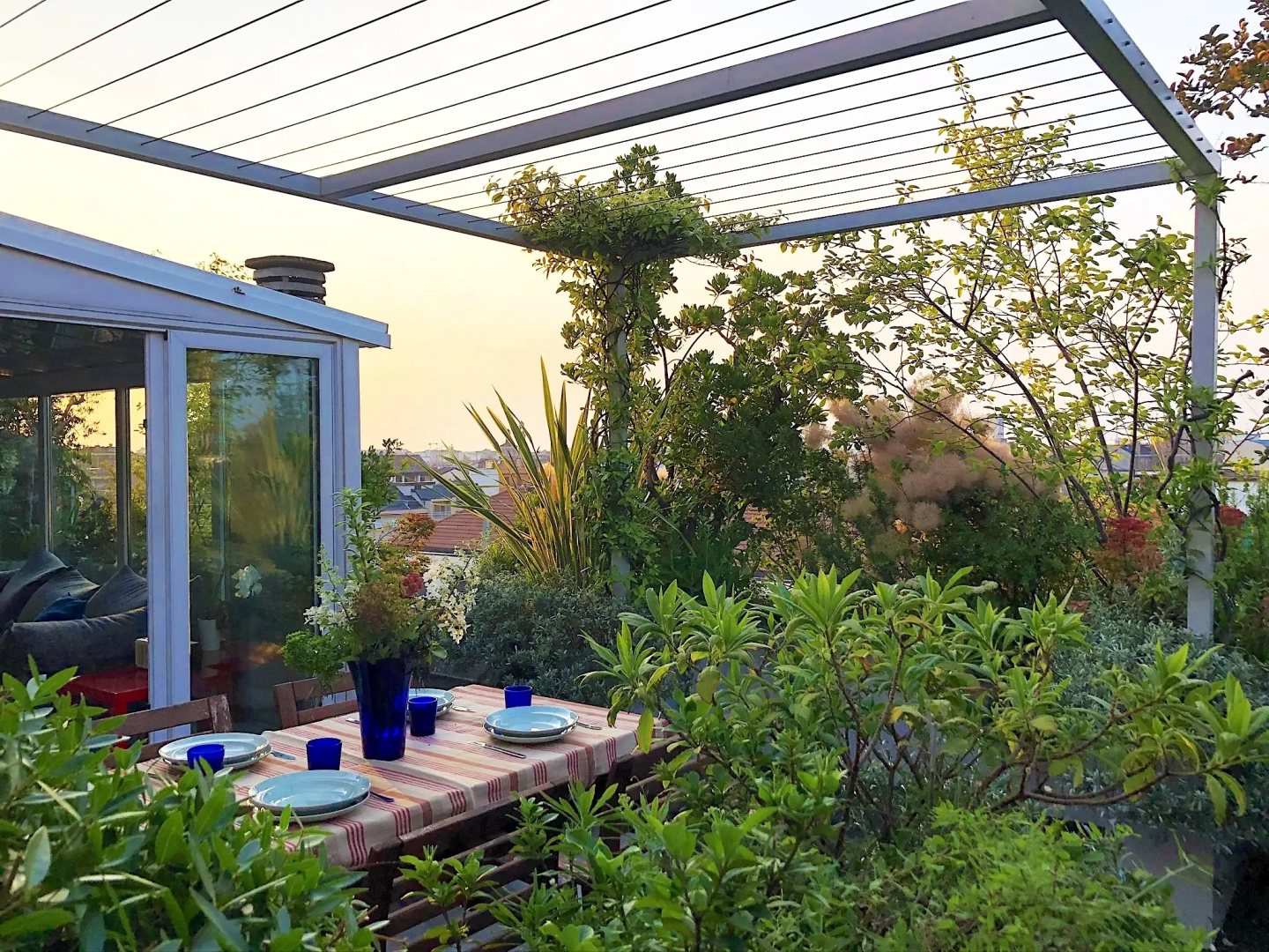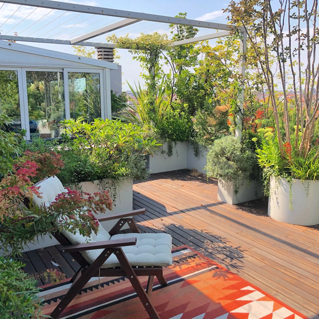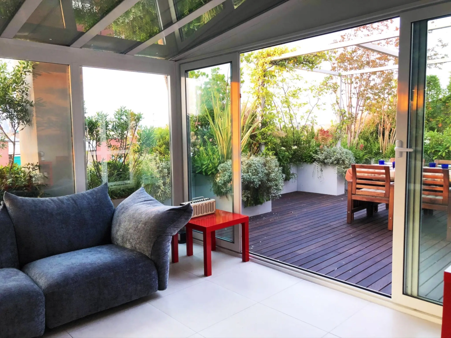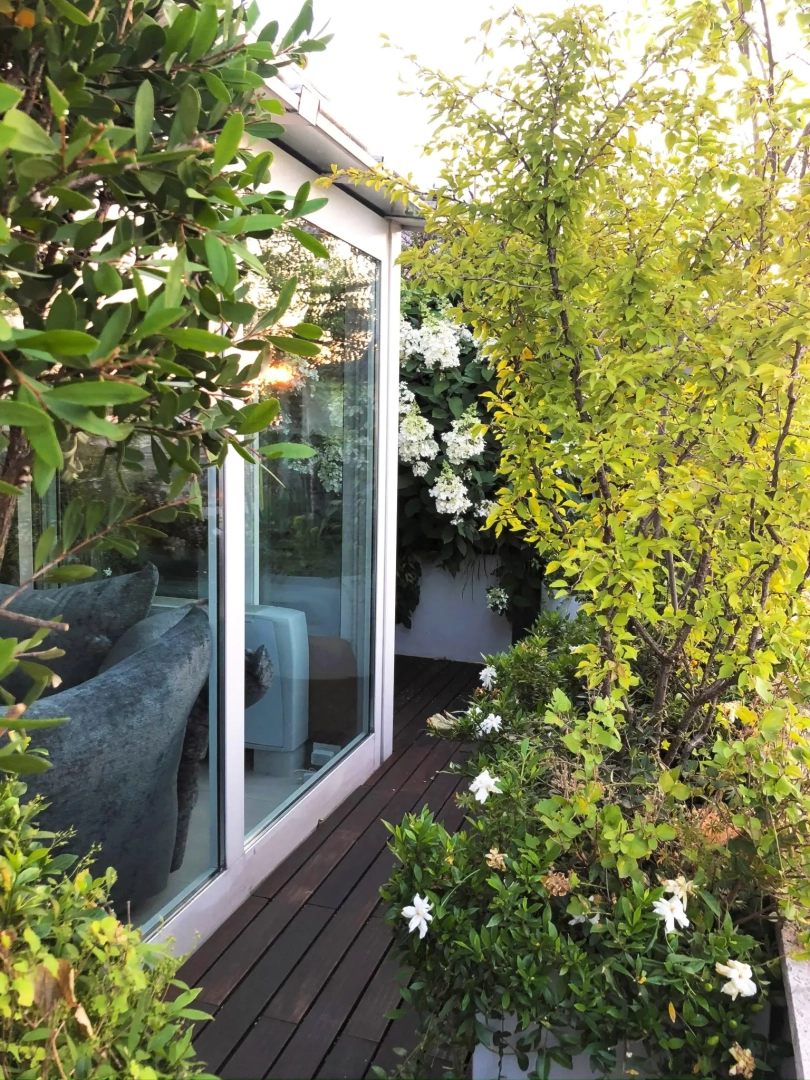 Un terrazzo creato e vissuto come naturale prosecuzione della casa, in comunicazione visiva con gli interni, attraverso le tante finestre che su di esso si affacciano, ma sempre fisicamente raggiungibile semplicemente attraversando uno dei tanti accessi disponibili.