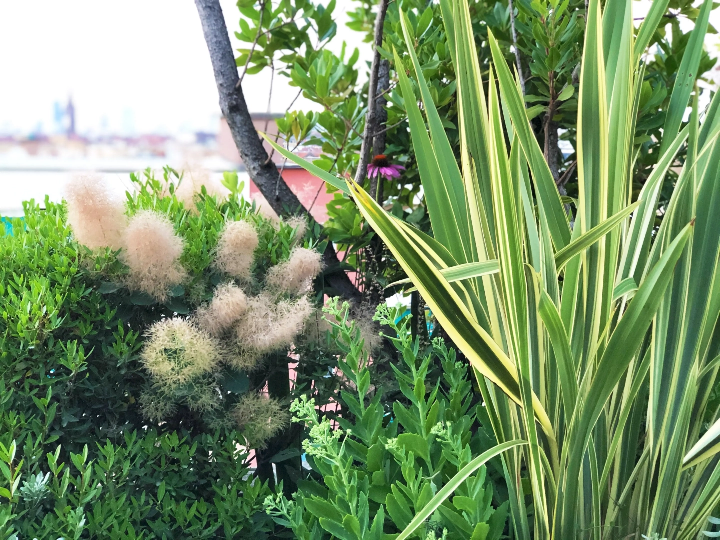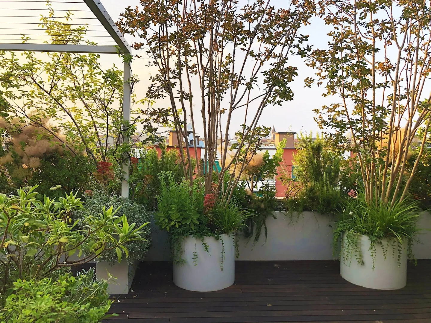 Due grandi Lagestroemie dal portamento verticale dirigono lo sguardo verso il cielo, donando spazialità, senza sottrarre spazio.