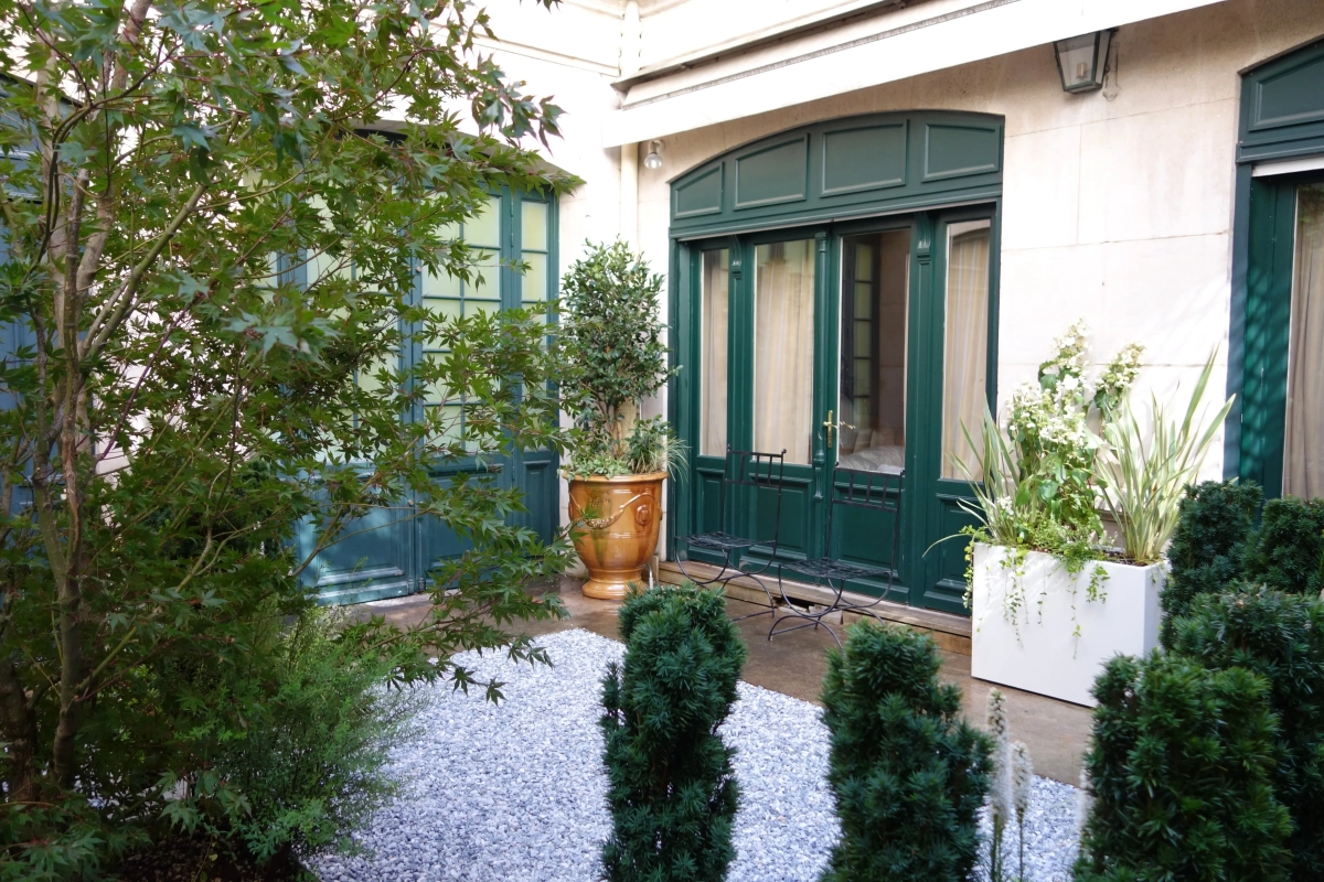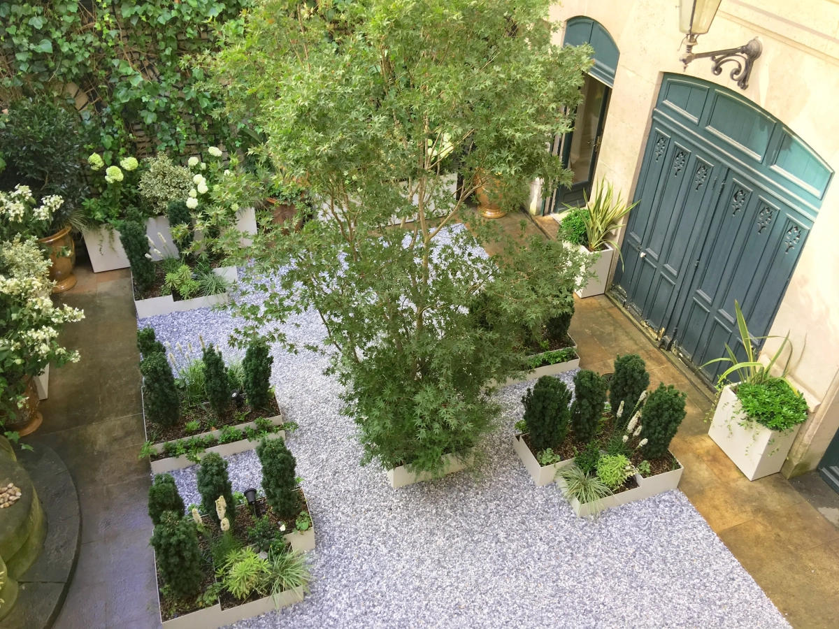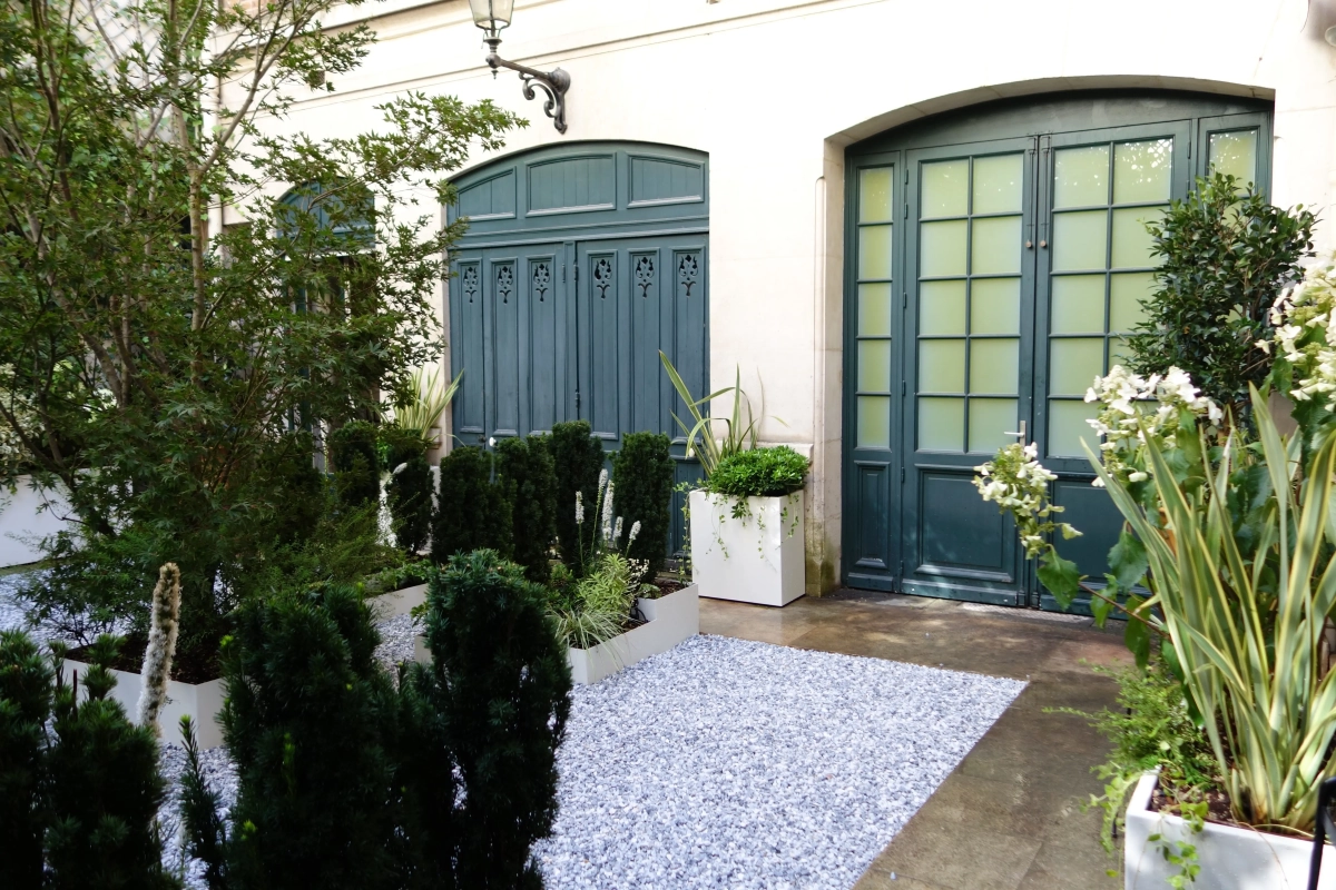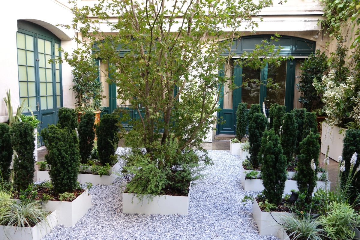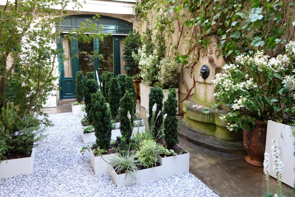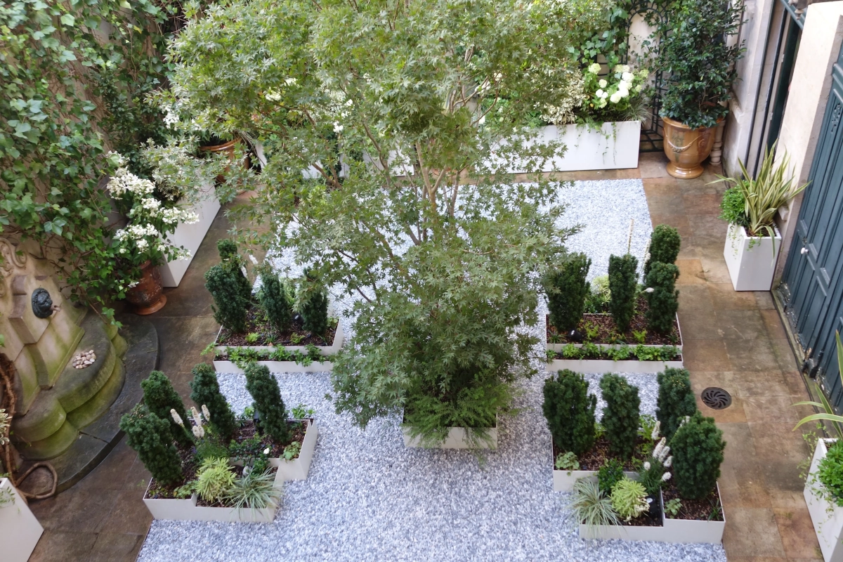 Un piccolo giardino, circondato a ferro di cavallo da una ricercata abitazione privata nel cuore di Parigi, costituisce un prezioso affaccio dalle finestre del piano superiore e un’oasi segreta in cui rifugiarsi. Le mura perimetrali creano un contesto ombroso, rischiarato da raffinate fioriture e variegature del fogliame sui toni del bianco e verde, declinato in molteplici sfumature, e da contenitori grigio luce che emergono dalla ghiaia chiara. Un giardino, pur nella sua sofisticatezza, a bassa manutenzione; una reinterpretazione in chiave moderna del giardino formale alla francese.