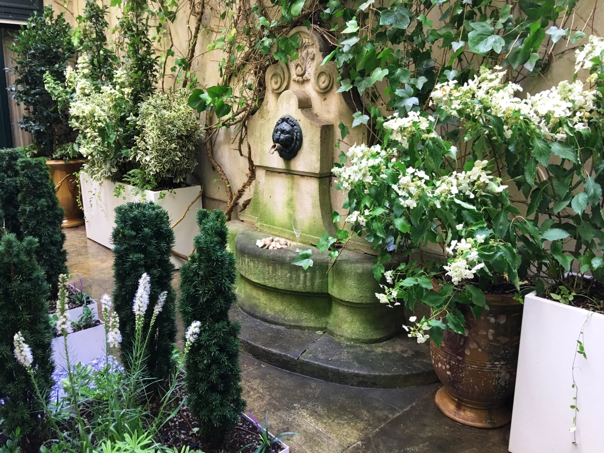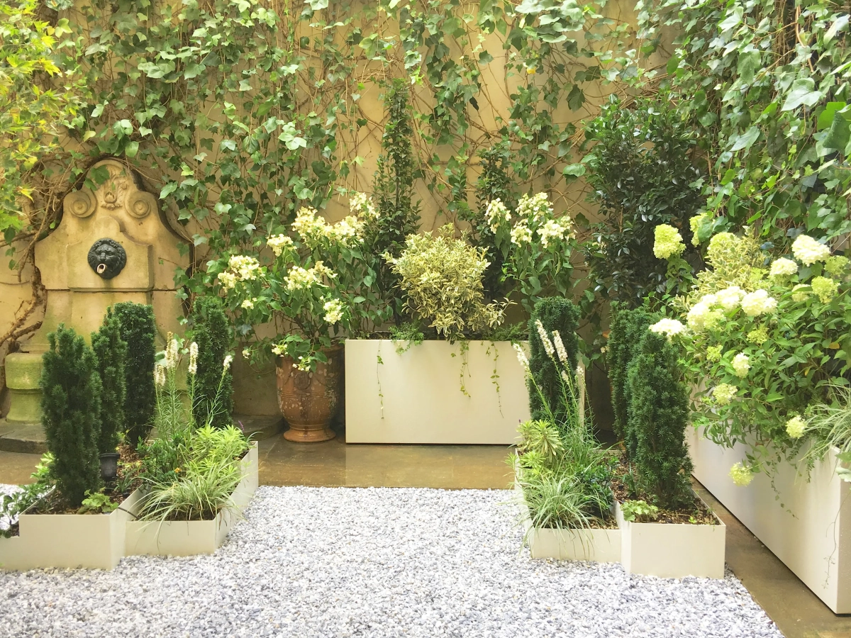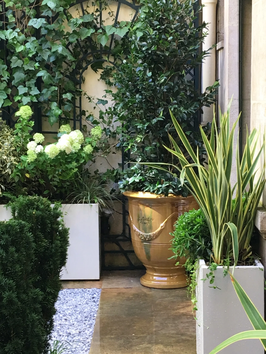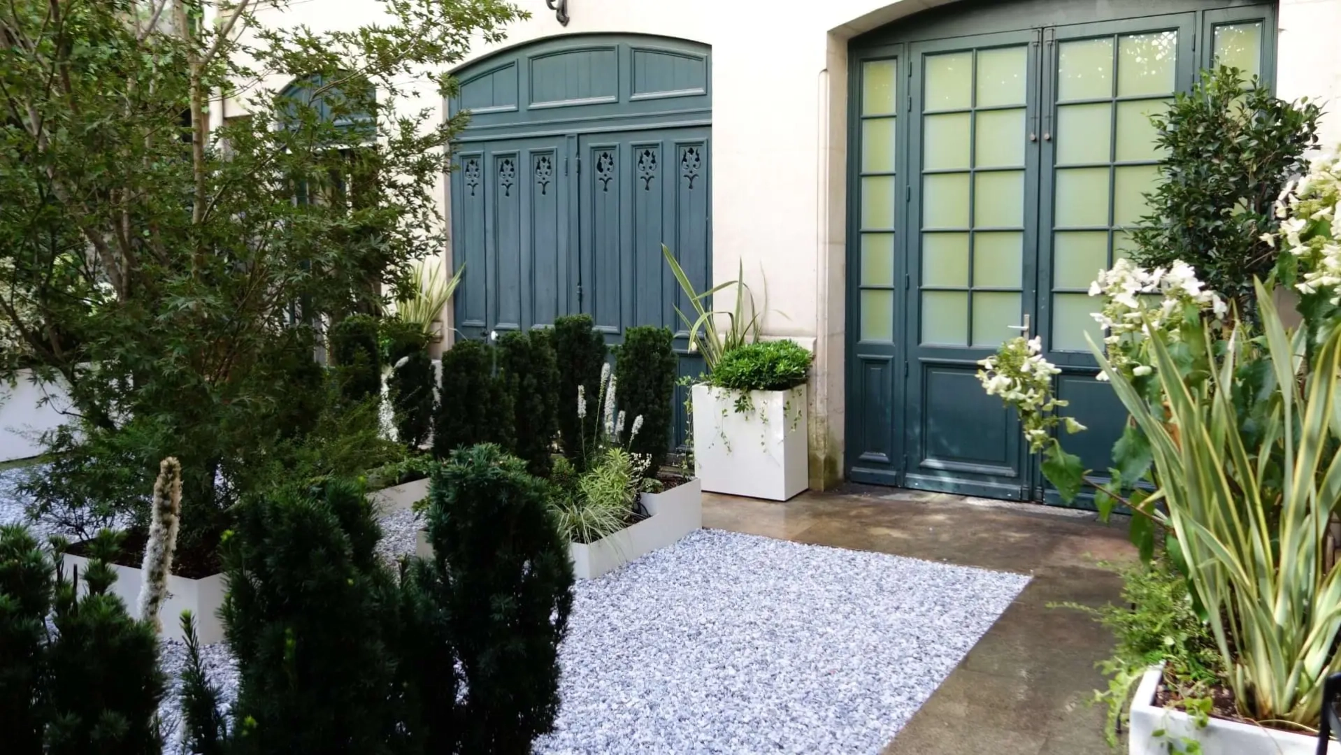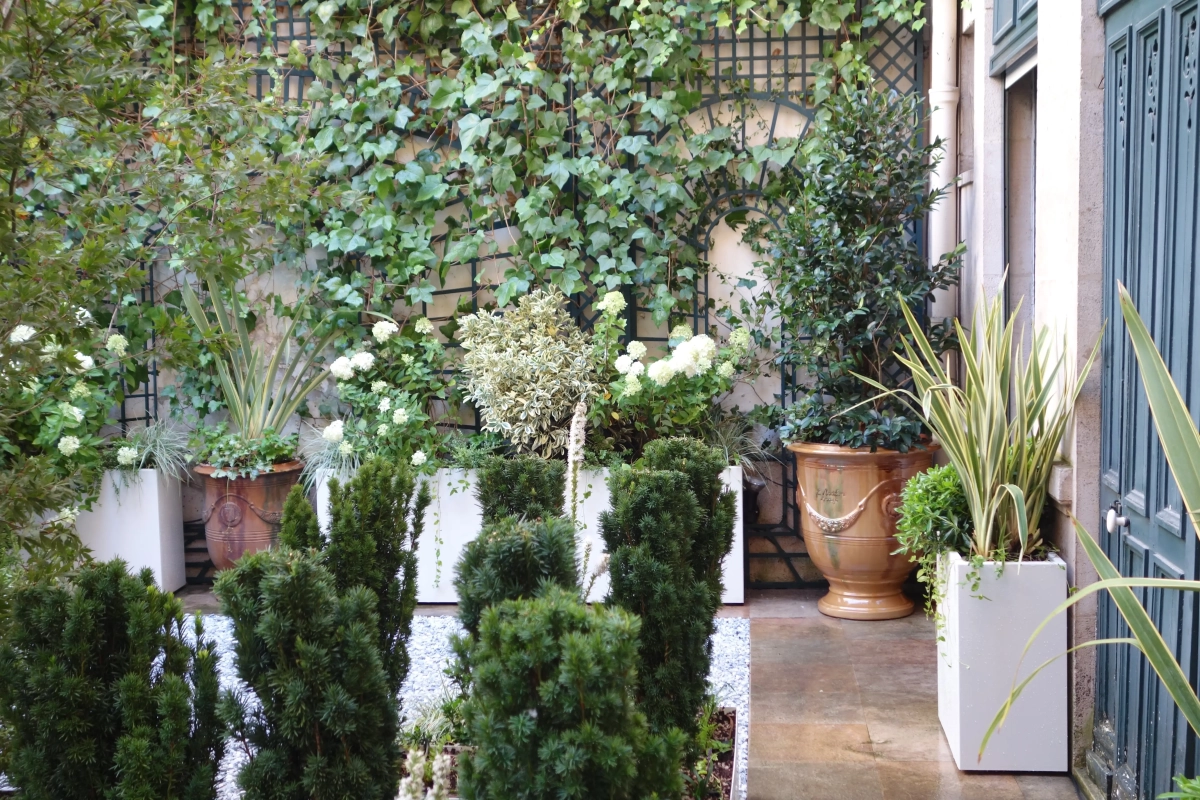 Un piccolo giardino, circondato a ferro di cavallo da una ricercata abitazione privata nel cuore di Parigi, costituisce un prezioso affaccio dalle finestre del piano superiore e un’oasi segreta in cui rifugiarsi. Le mura perimetrali creano un contesto ombroso, rischiarato da raffinate fioriture e variegature del fogliame sui toni del bianco e verde, declinato in molteplici sfumature, e da contenitori grigio luce che emergono dalla ghiaia chiara. Un giardino, pur nella sua sofisticatezza, a bassa manutenzione; una reinterpretazione in chiave moderna del giardino formale alla francese.