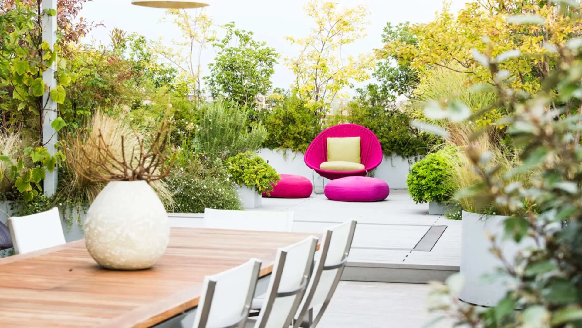 Un grande terrazzo unisce il rigore del disegno e l’esuberanza della vegetazione, accogliendo i desideri apparentemente opposti dei proprietari: atmosfera libera e campestre per lei, ordinata e disciplinata per lui.
