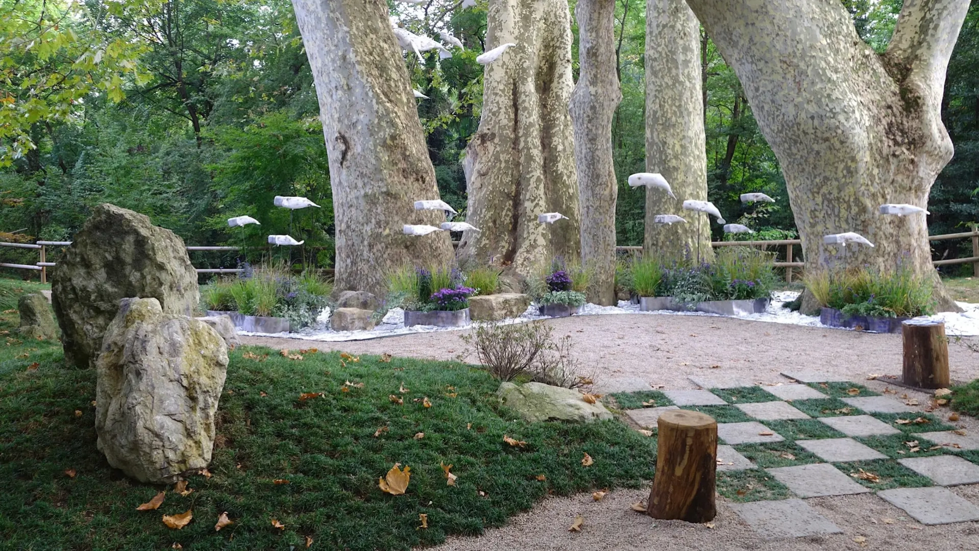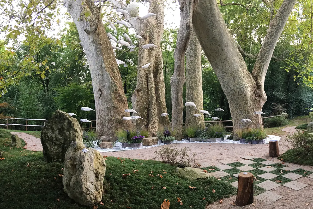 Sospesi nel magico colonnato naturale dei platani secolari di Villa Erba, grandi capodogli e megattere, frutto del talento e della fantasia dell’artista Stefano Prina, fluttuano nell’aria tersa e intonano il loro canto ancestrale che si perde nel cielo. Accompagnati dal chiarore lunare, questi leviatani degli oceani si elevano alla ricerca di grandi spazi che il mare, riprodotto attraverso una distesa di fioriture e spighe leggere nei toni degli azzurri e bianchi, divenuto troppo denso e inquinato, non è più in grado di offrire.