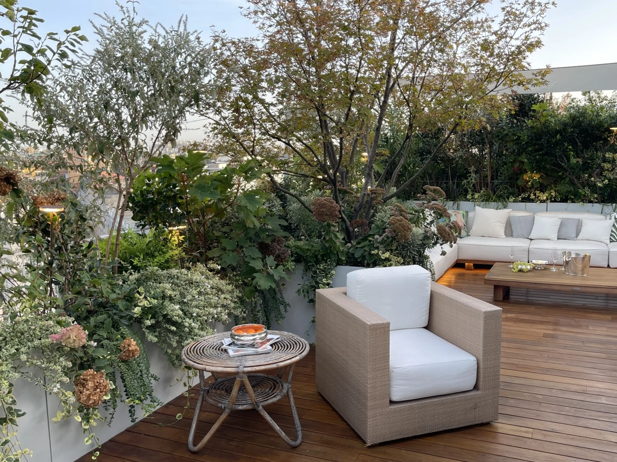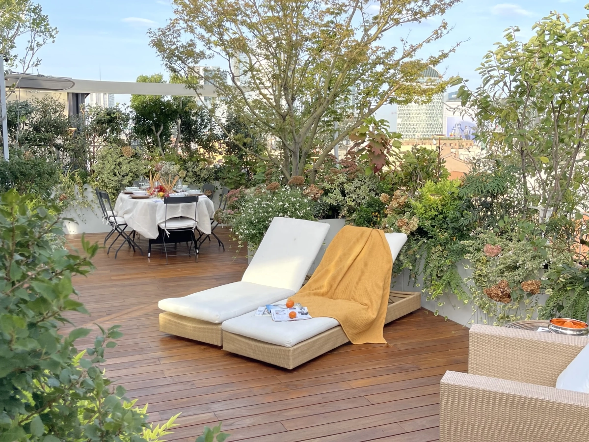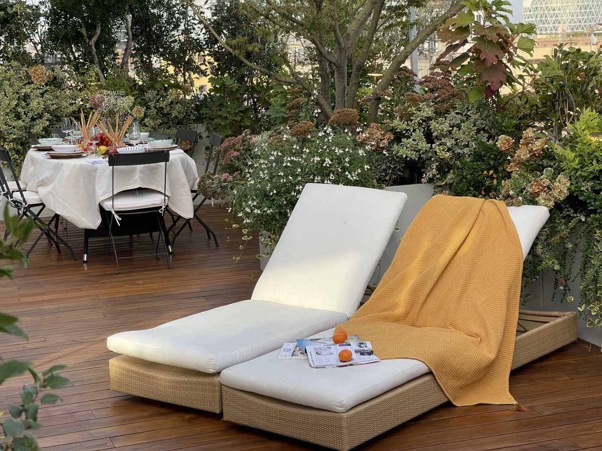 Frutto della felice sinergia tra Cristina e la padrona di casa, l’architetto Priscilla Gouveia, i 100 metri quadrati di terrazzo che avvolgono l’abitazione sono stati suddivisi attraverso gli arredi e le fioriere in una successione di ambienti funzionali: una zona dedicata alla convivialità a tavola, protetta da un’ombreggiatura gentile; una zona intermedia in grado di accogliere lettini prendisole e poltroncine oppure di restare libera per ospitare molte persone in occasione di eventi e feste; la zona living,