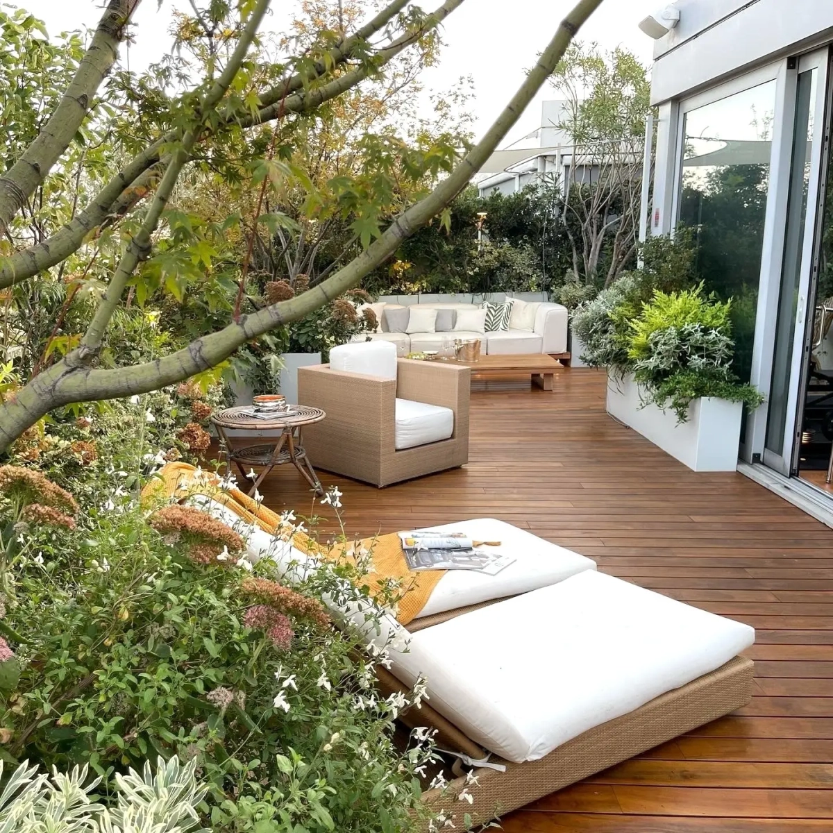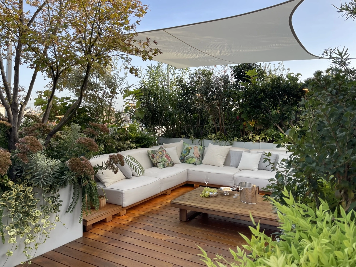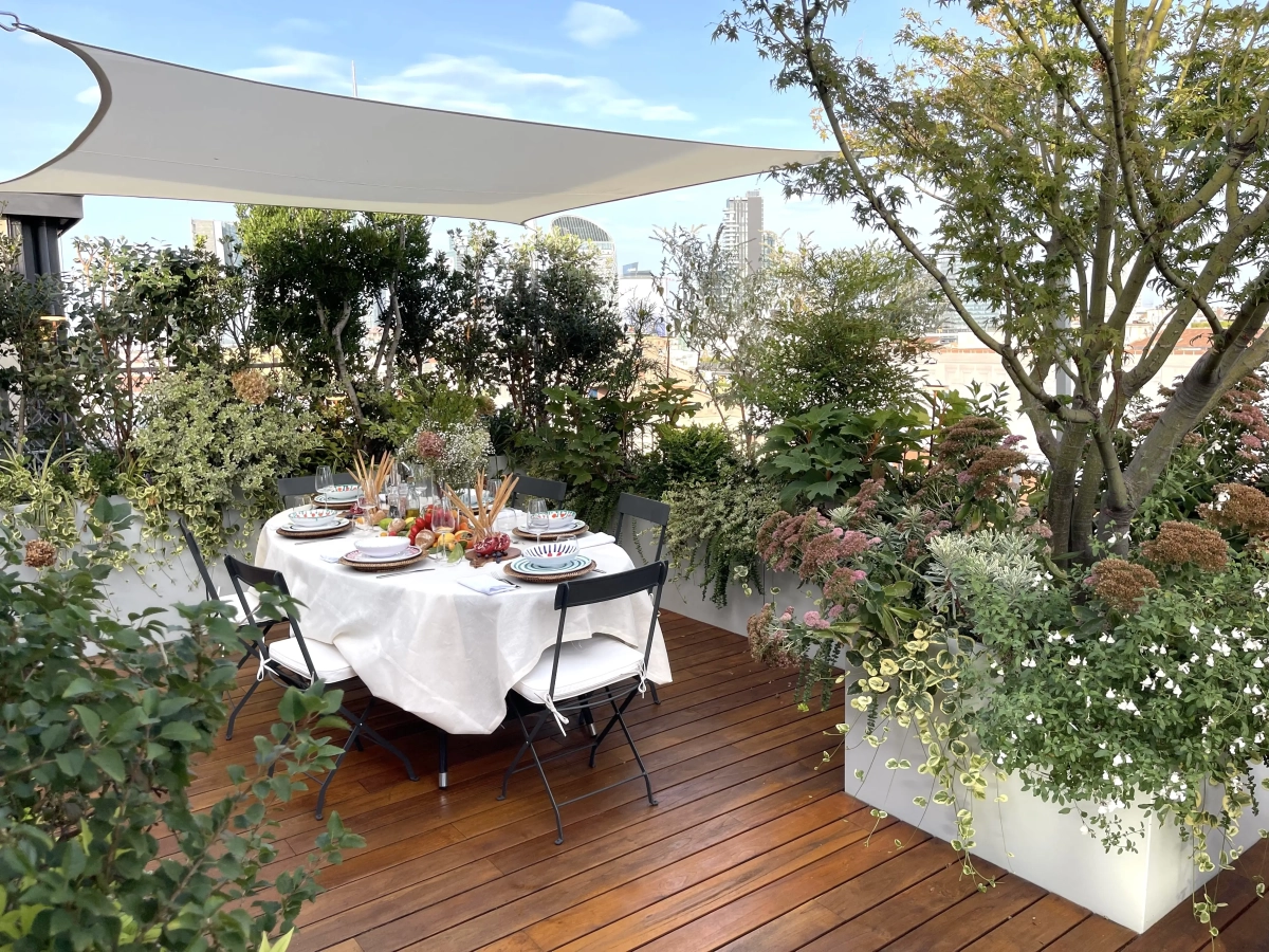Frutto della felice sinergia tra Cristina e la padrona di casa, l’architetto Priscilla Gouveia, i 100 metri quadrati di terrazzo che avvolgono l’abitazione sono stati suddivisi attraverso gli arredi e le fioriere in una successione di ambienti funzionali: una zona dedicata alla convivialità a tavola, protetta da un’ombreggiatura gentile; una zona intermedia in grado di accogliere lettini prendisole e poltroncine oppure di restare libera per ospitare molte persone in occasione di eventi e feste; la zona living,